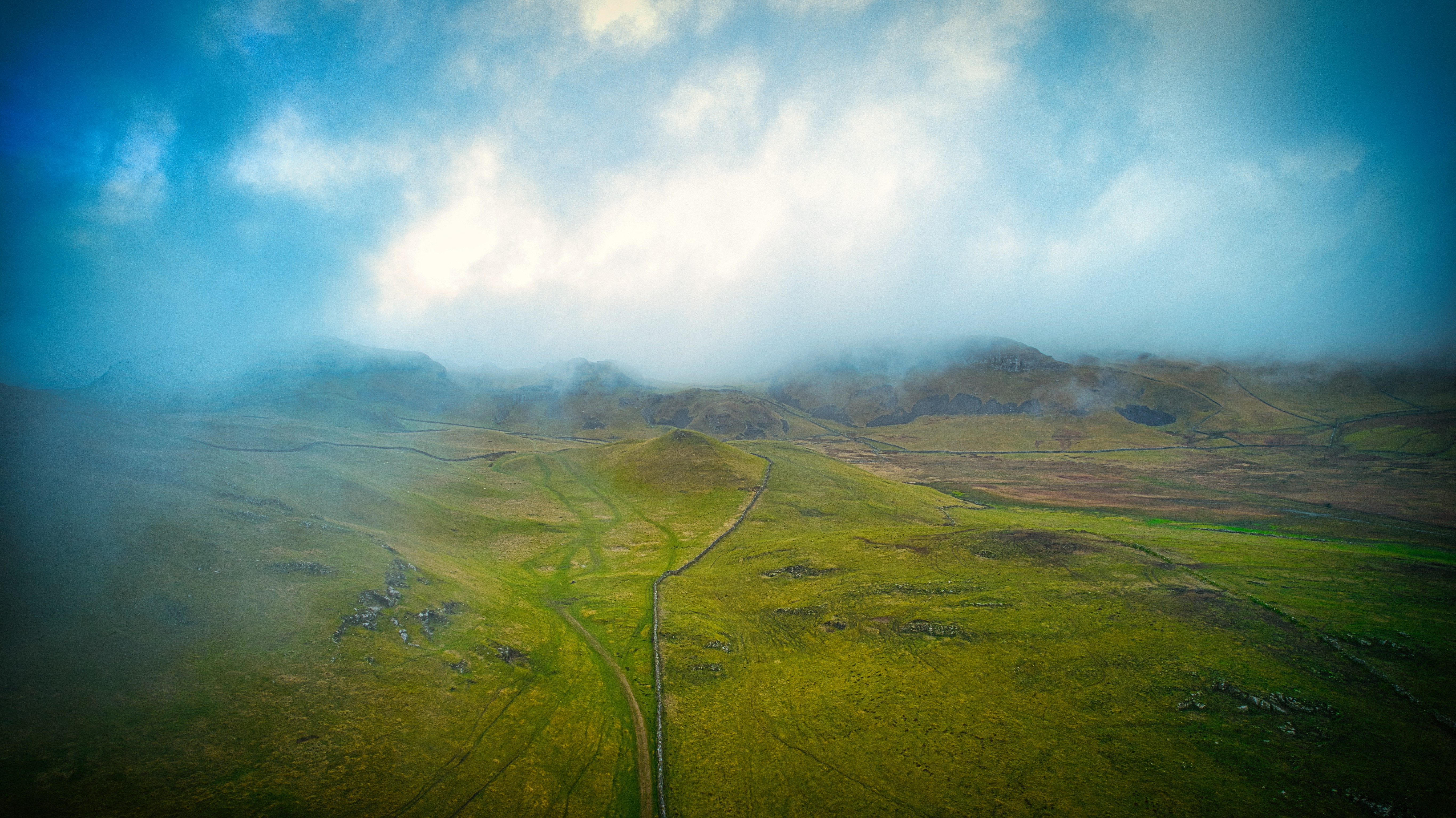 Misty landscape with a winding road through green hills under a cloudy sky.