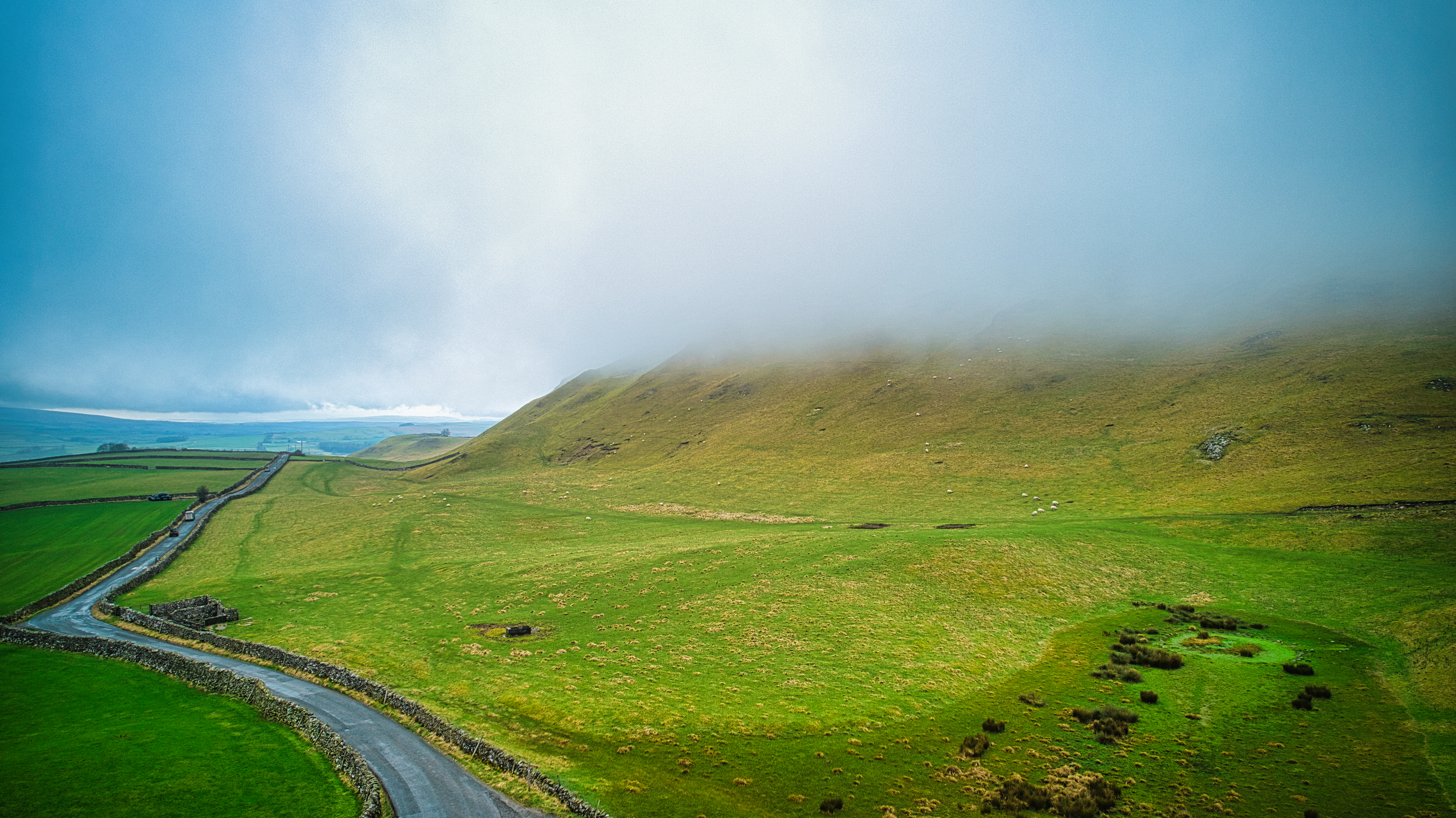 Misty landscape with a winding road through green hills under a cloudy sky.