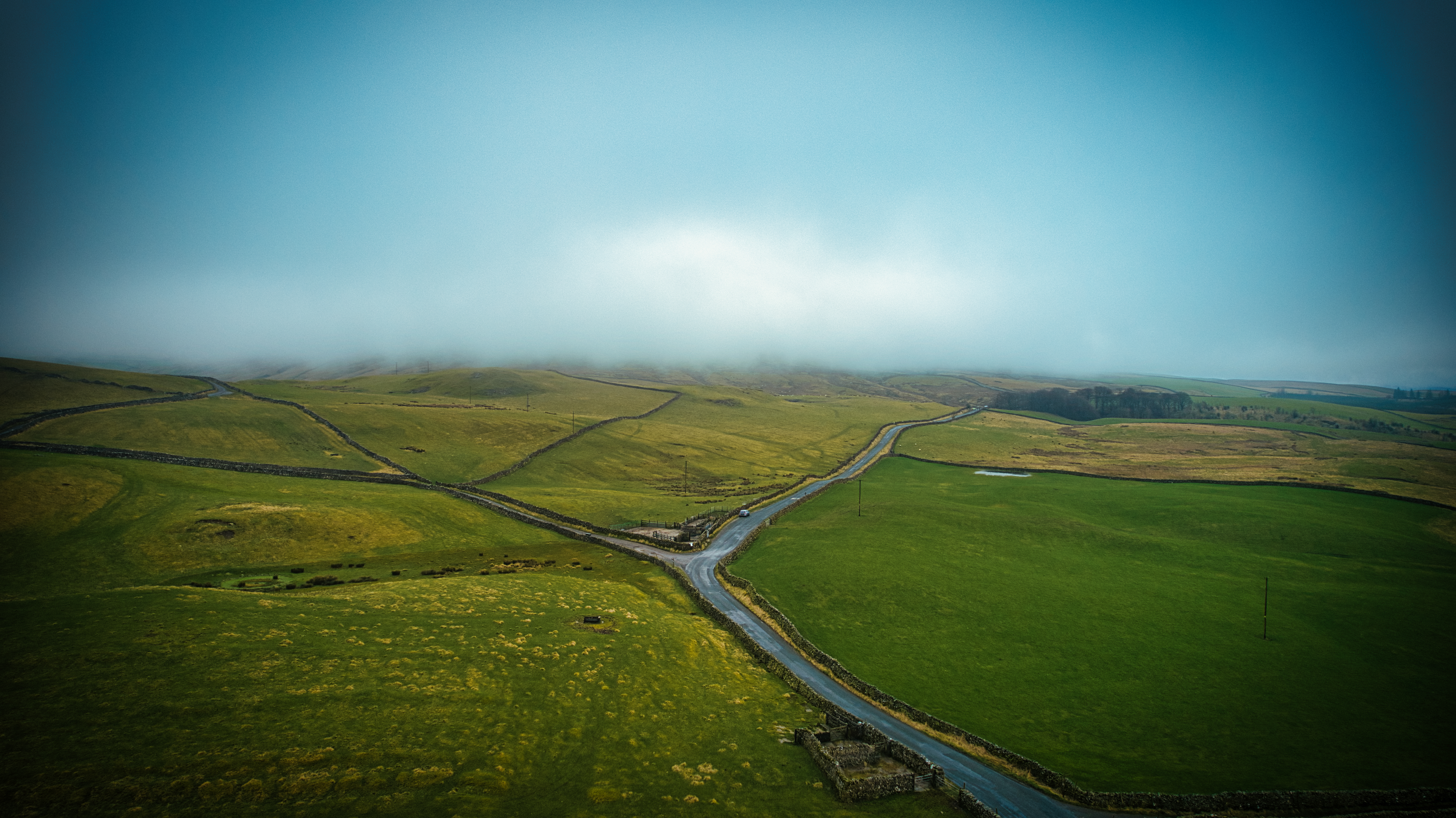 Misty landscape with winding road through green hills.