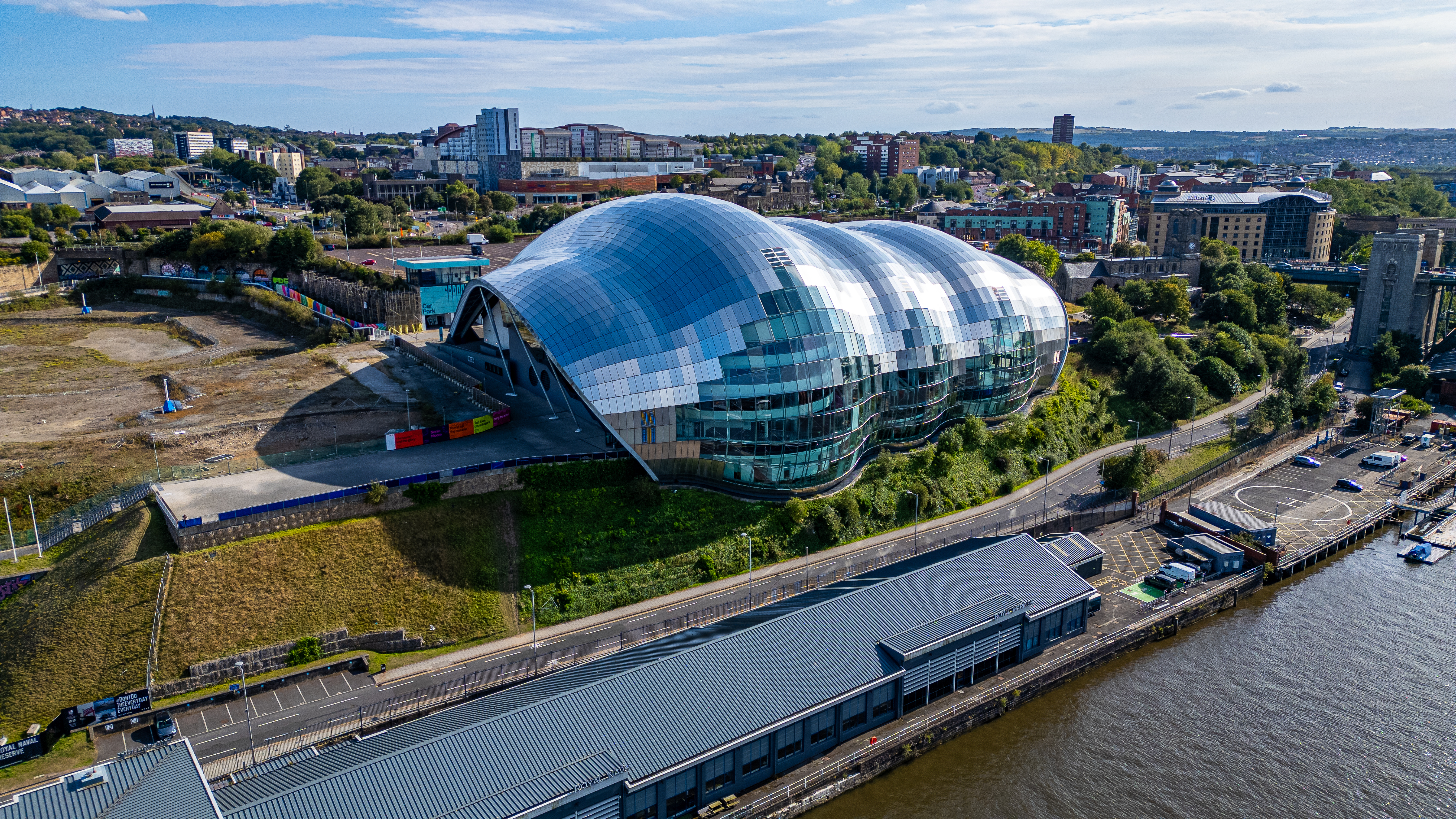 A modern, curved building with a glass and metal facade sits beside a river, surrounded by urban development and greenery under a blue sky in Newcastle upon Tyne, UK.