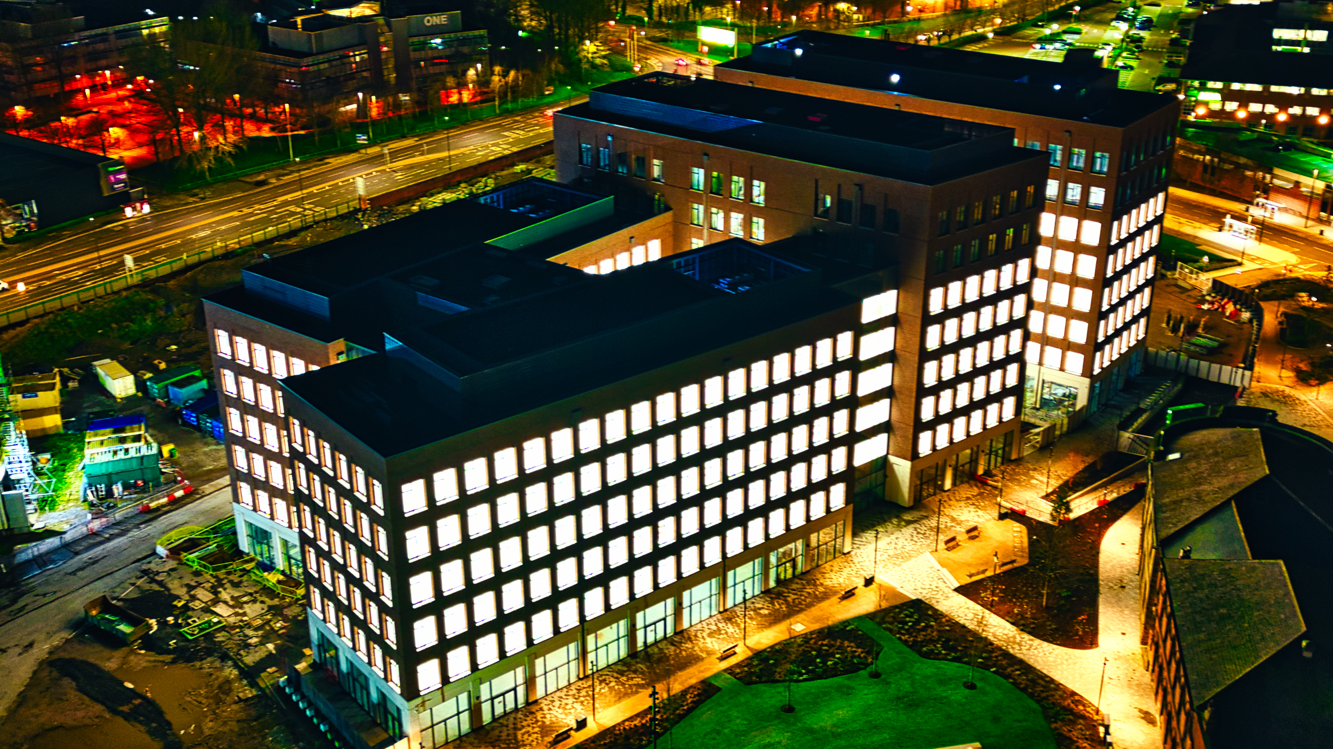 Modern office building illuminated at night, showcasing architectural design and urban environment in Leeds, UK.