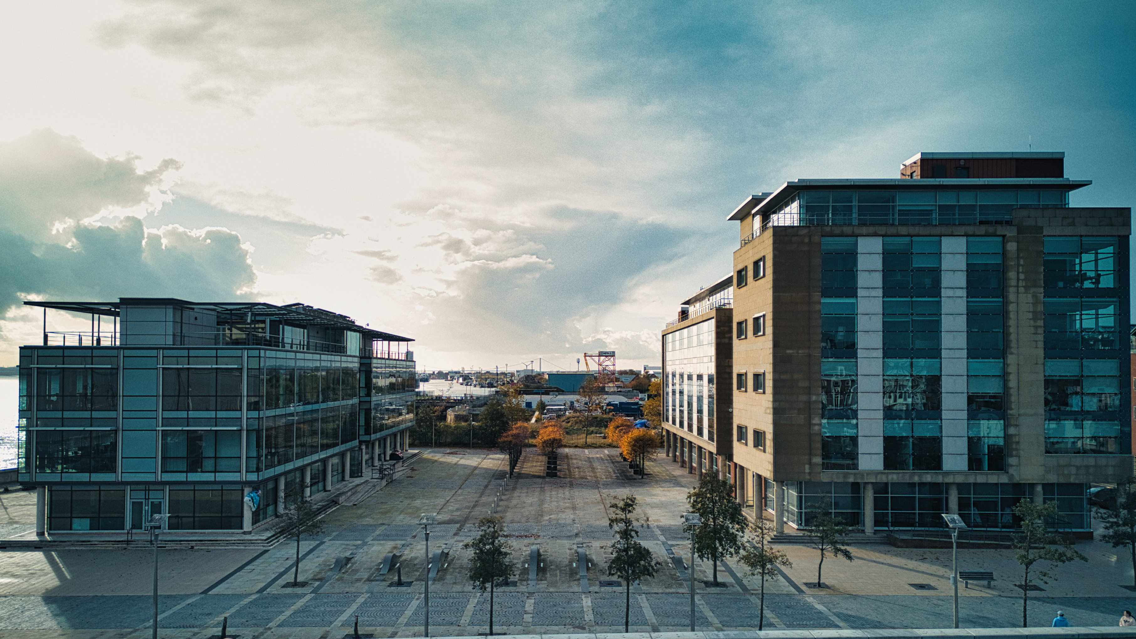 Modern office buildings with glass facades at sunset, urban landscape in Hull, England.
