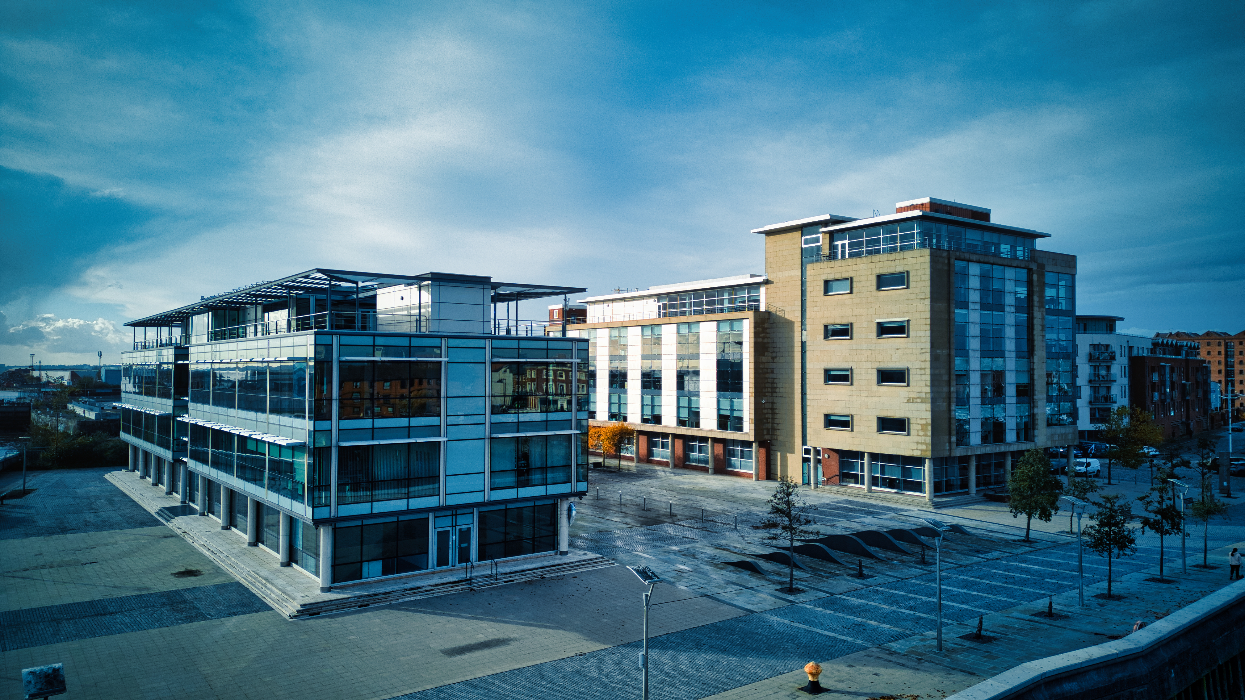 Modern office buildings with glass facades under cloudy sky, empty urban business district in Hull, England.