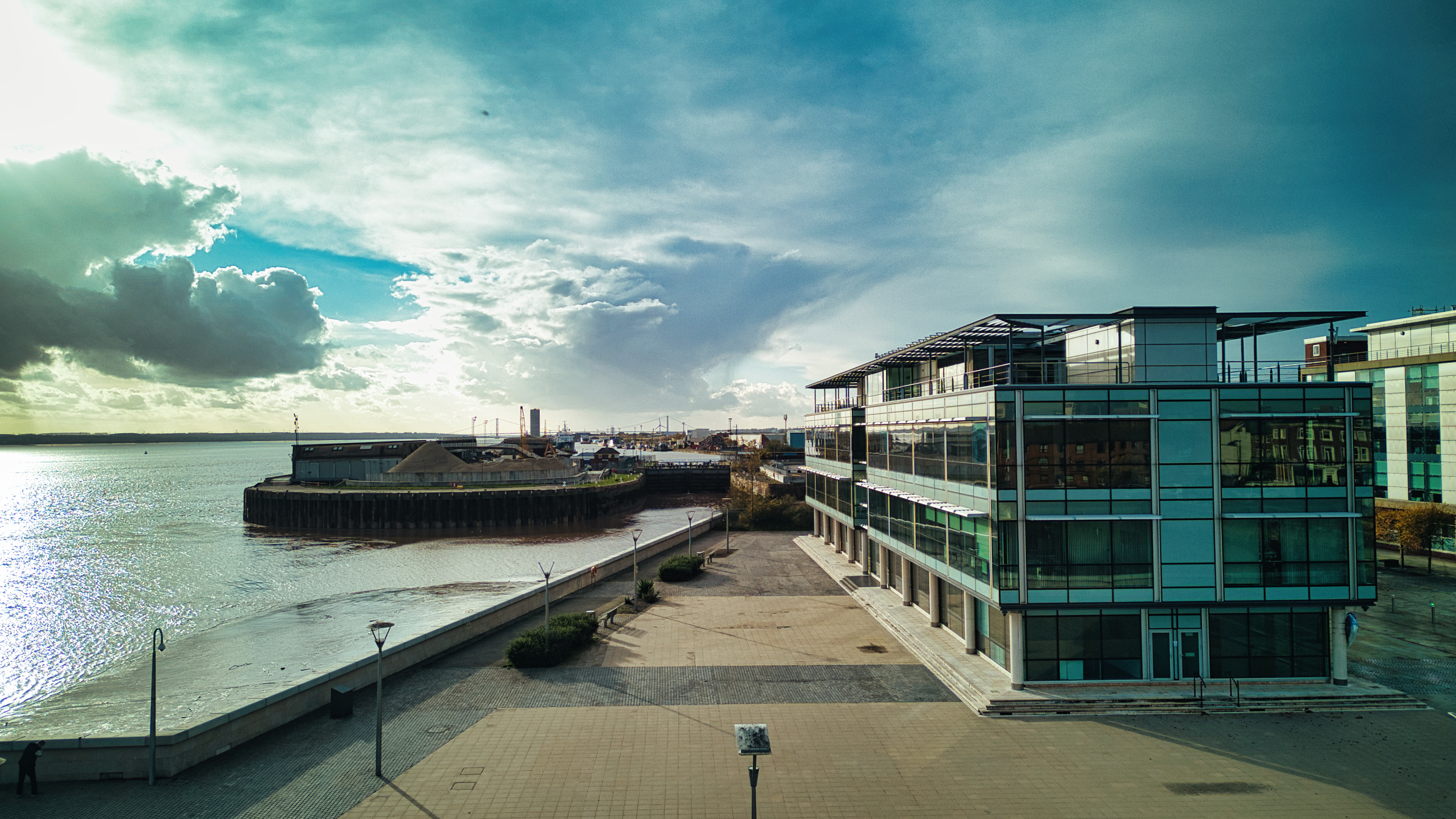 Modern waterfront office building with glass facade under a dramatic sky, adjacent to a calm river and a docked boat in Hull, England.