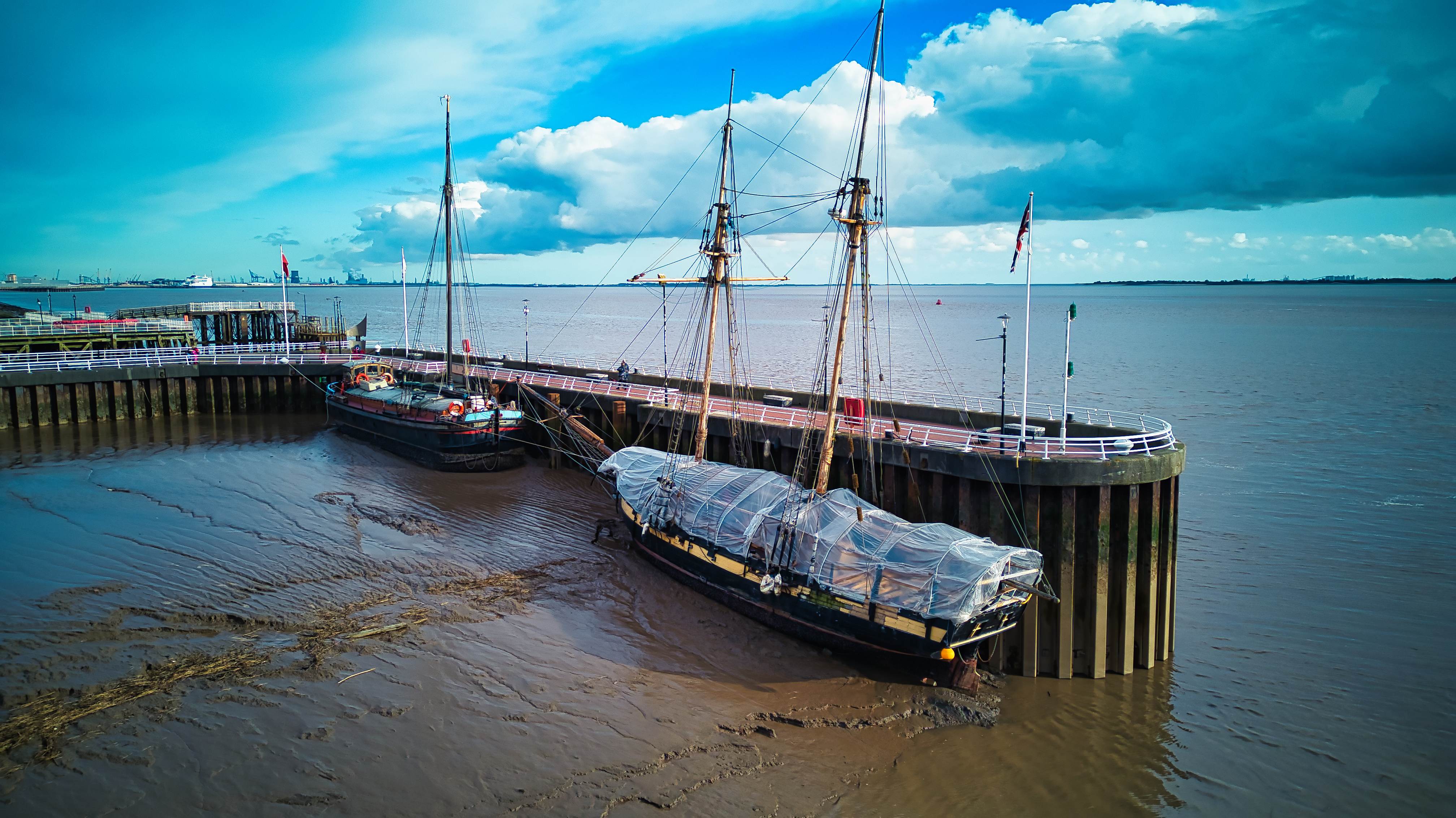 Moored sailboat at low tide by a wooden pier under a cloudy sky in Hull, England.