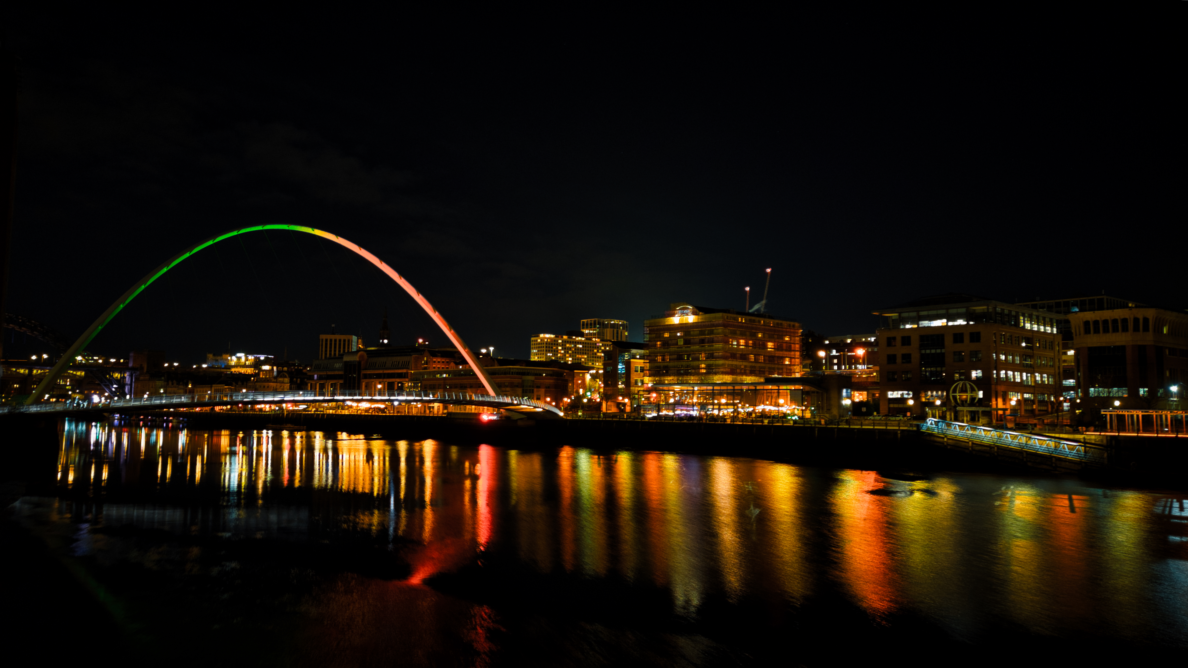 Night cityscape with a colorful arch bridge reflected in the water in Newcastle upon Tyne