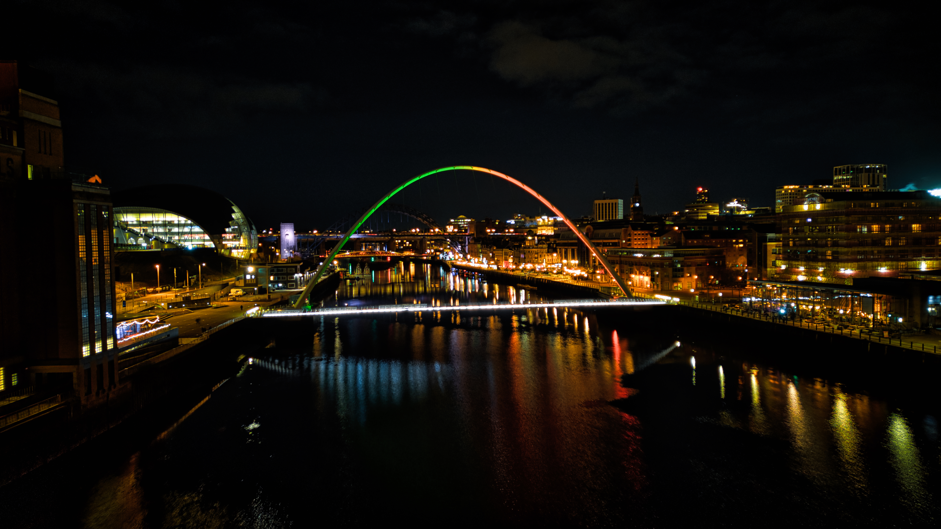 Night cityscape with illuminated arch bridge reflecting on water, urban skyline in background in Newcastle upon Tyne