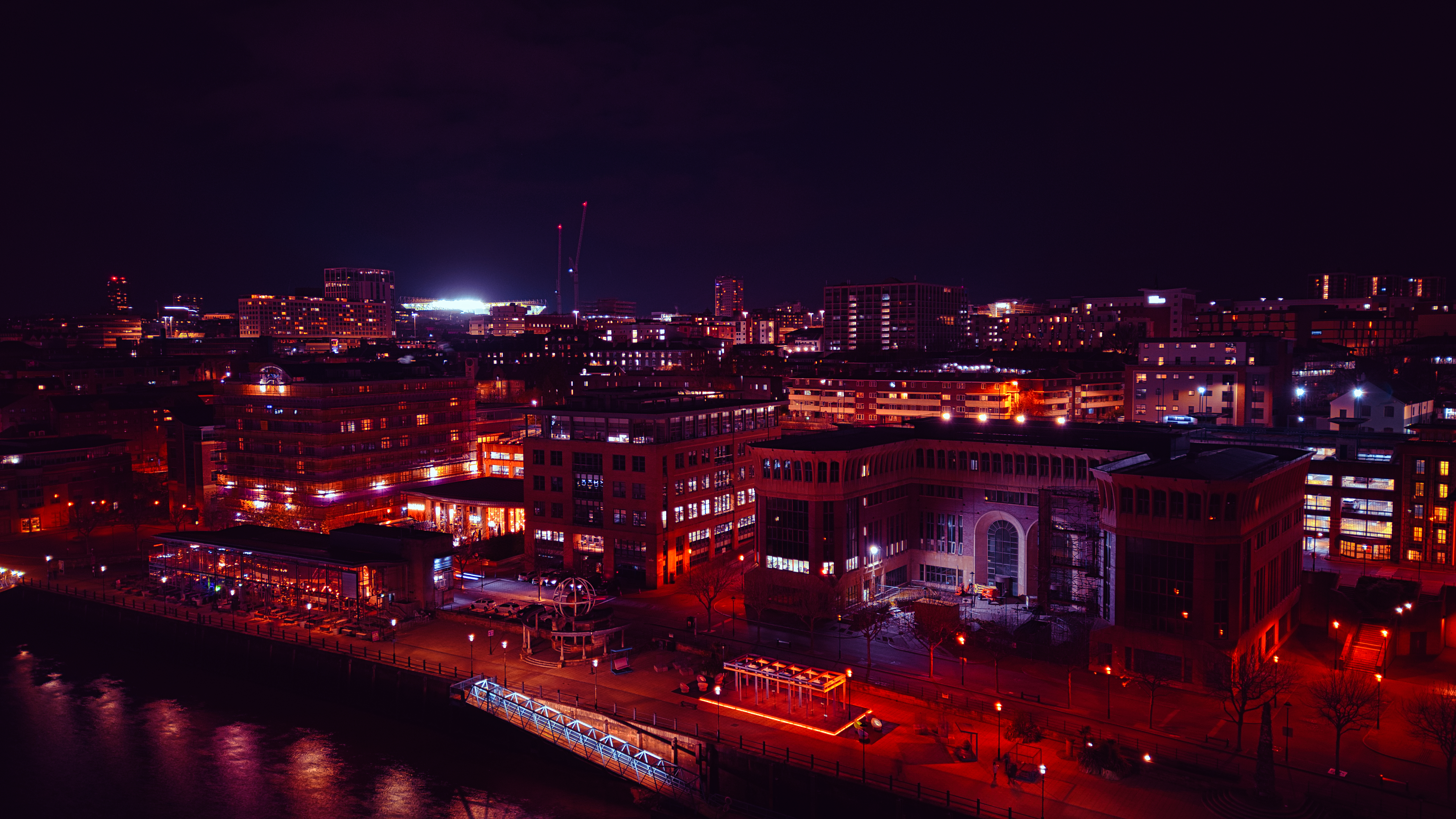 Night cityscape with illuminated buildings and waterfront, showcasing urban nightlife and architecture in Newcastle upon Tyne