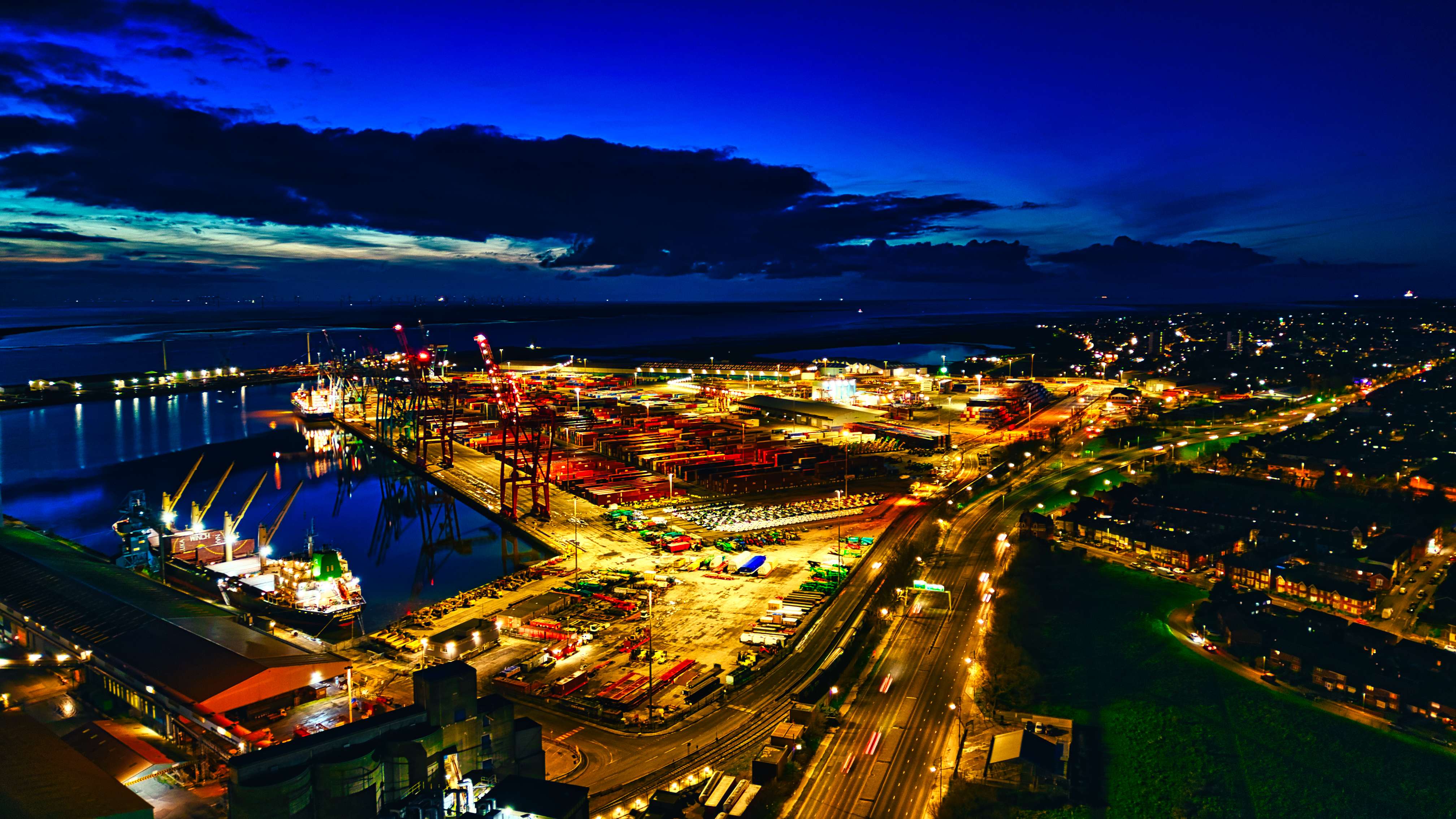 Nighttime aerial view of a bustling port with illuminated cranes, cargo containers, and city lights reflecting on the water in Liverpool, UK.