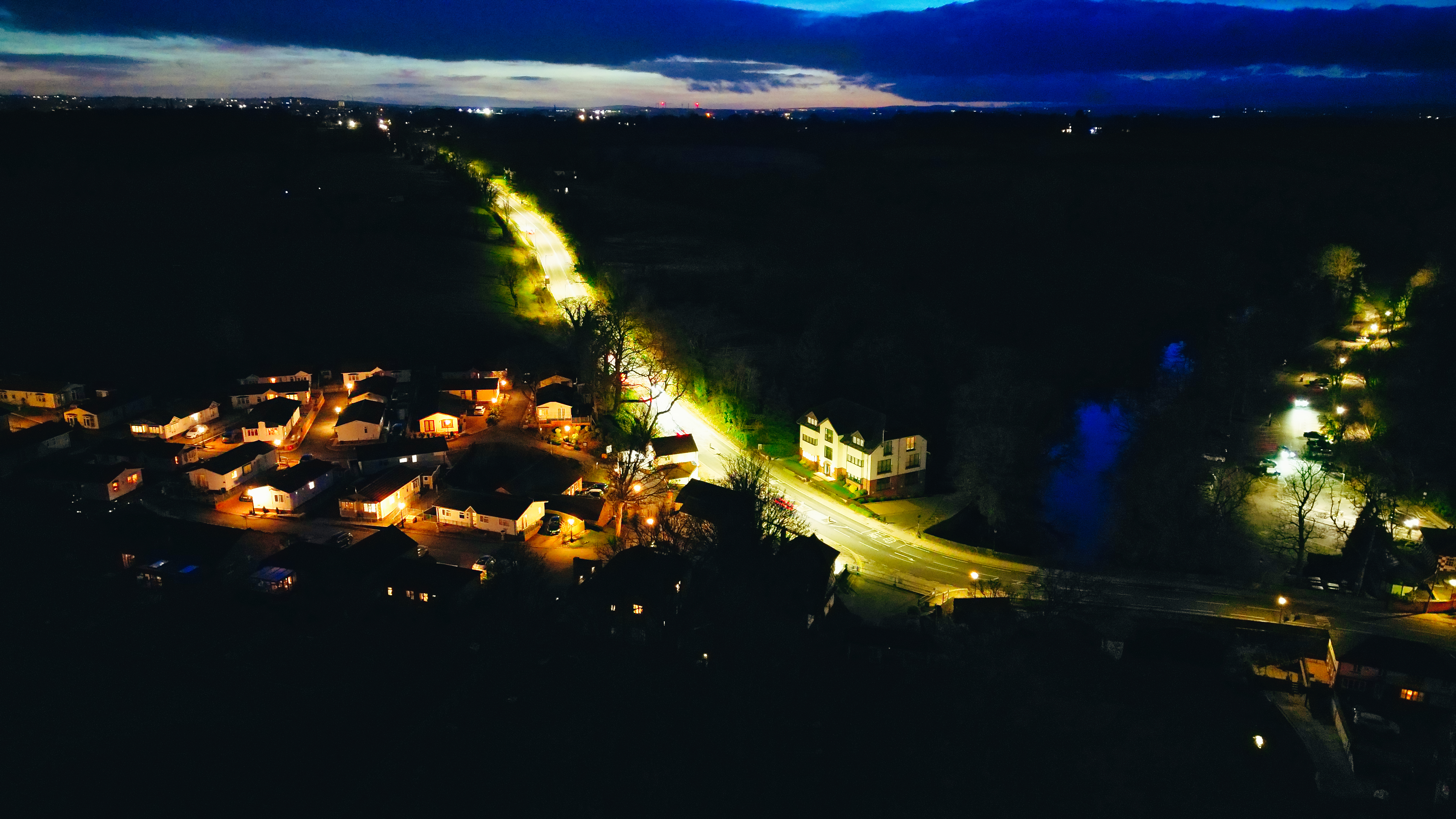 Nighttime aerial view of a small town with illuminated streets and houses against a dark landscape in Knaresborough, North Yorkshire