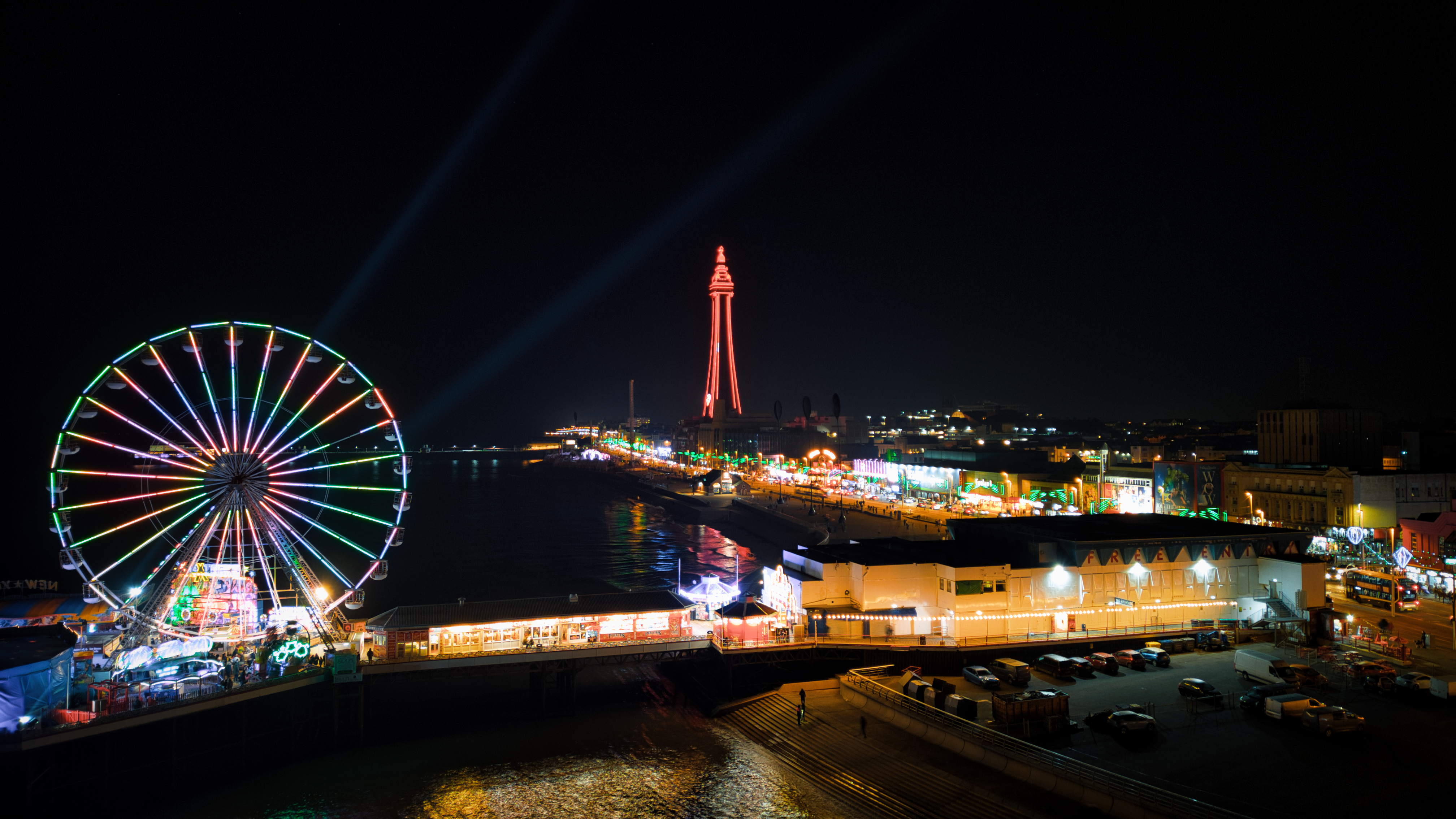 Nighttime cityscape with illuminated Ferris wheel and tower, festive lights, and waterfront view in Backpool, England.