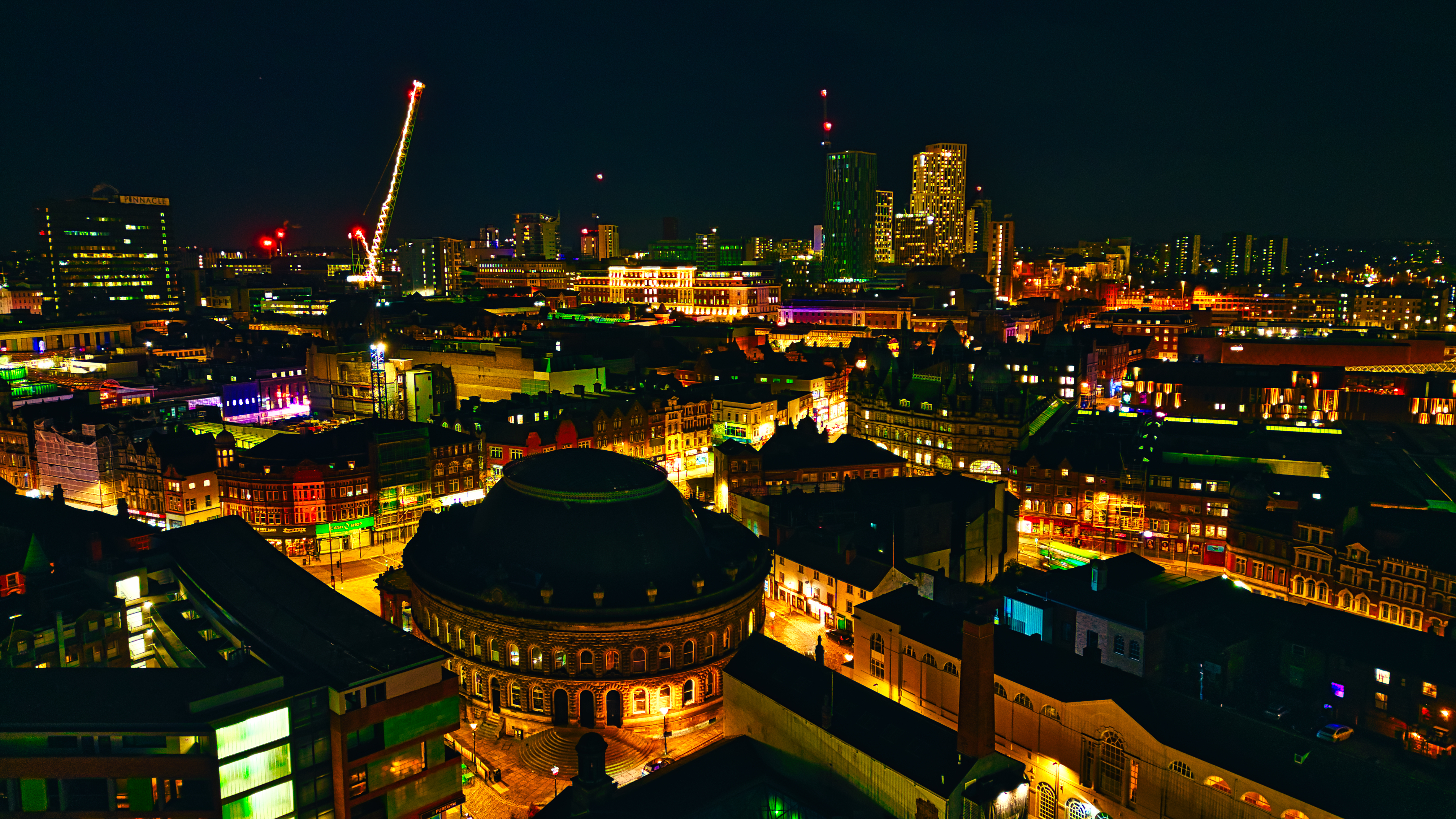 Nighttime cityscape with illuminated buildings and construction cranes, showcasing urban development in Leeds, UK.