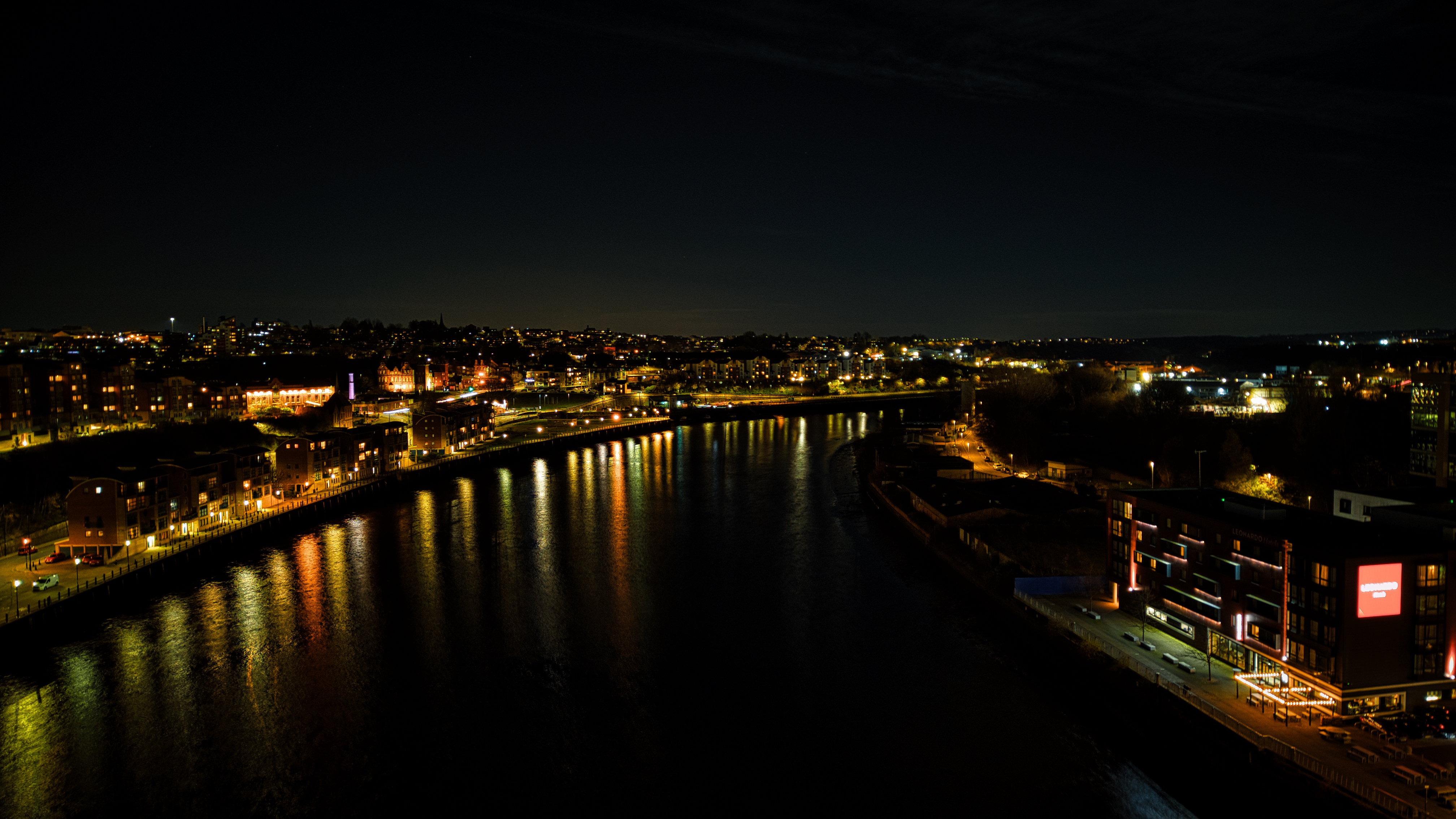 Nighttime cityscape with illuminated buildings reflecting on a calm river, showcasing urban beauty and tranquility in Newcastle upon Tyne