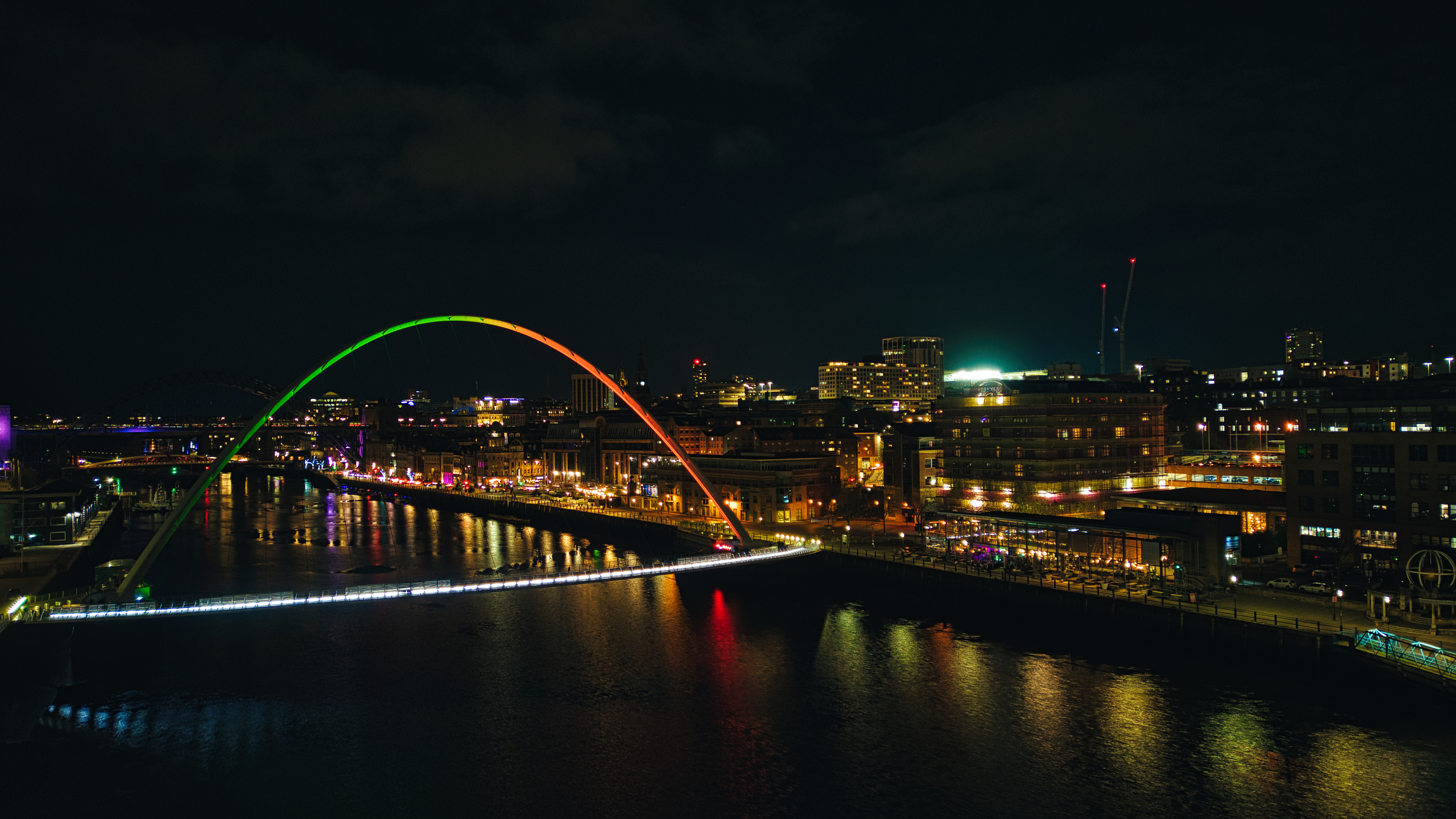 Nighttime cityscape with illuminated rainbow bridge reflecting on water, showcasing urban architecture and vibrant nightlife in Newcastle upon Tyne
