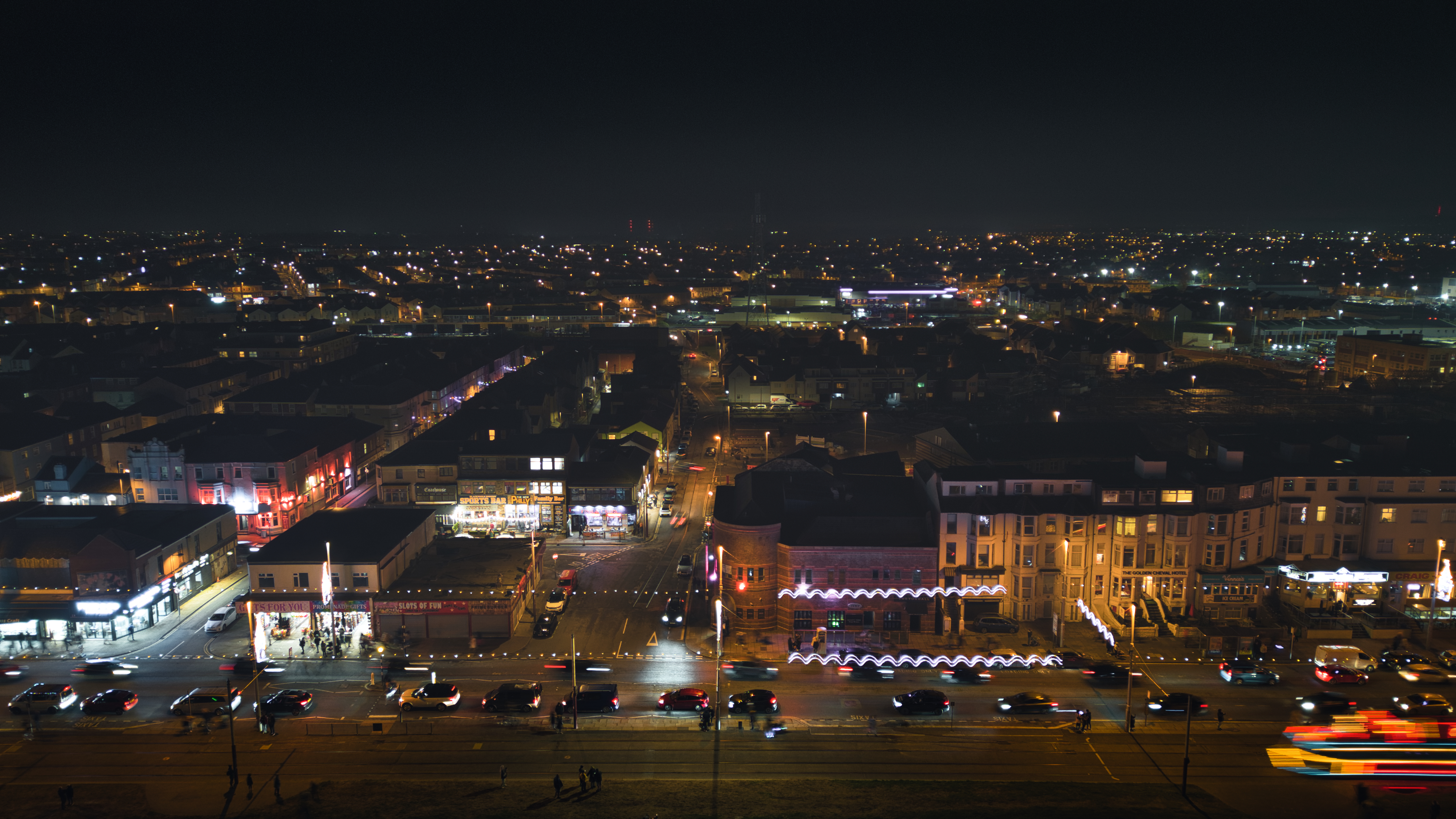 Nighttime cityscape with illuminated streets and buildings, showcasing urban life and architecture in Backpool, England.
