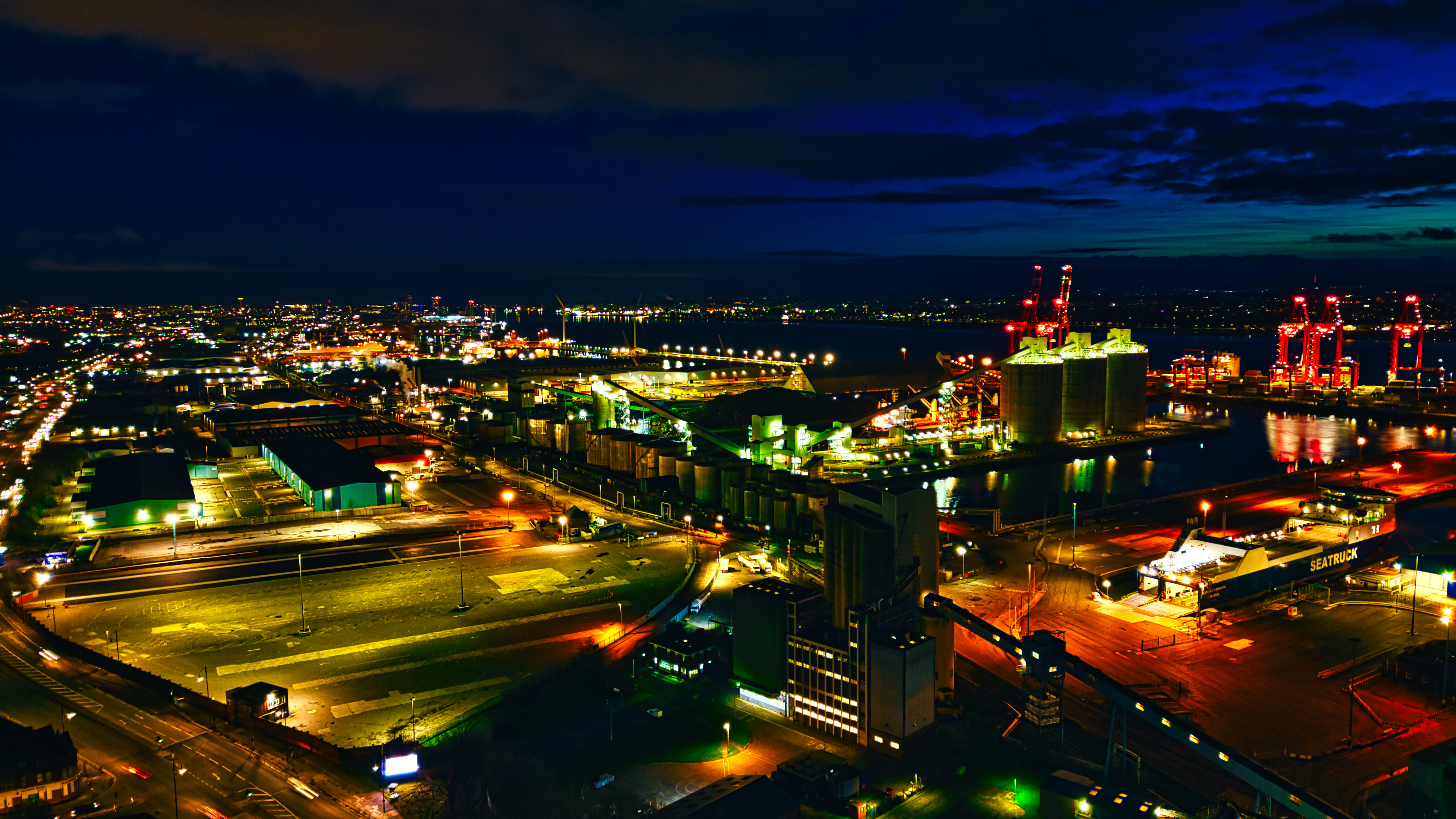 Nighttime cityscape with illuminated streets and buildings, showcasing urban life and infrastructure in Liverpool, UK.