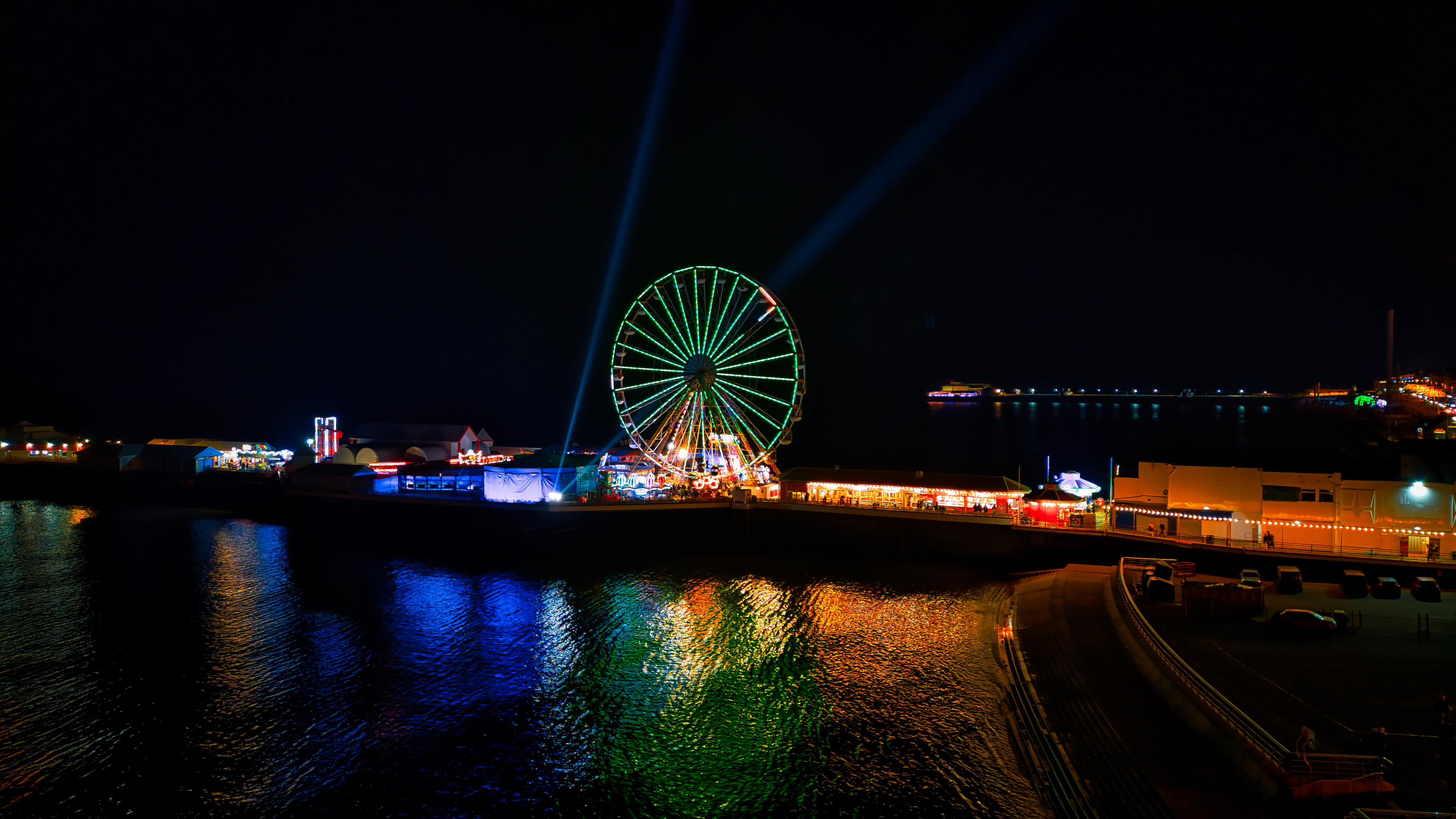 Nighttime view of a lit Ferris wheel by the water with colorful reflections and searchlights in the sky in Backpool, England.