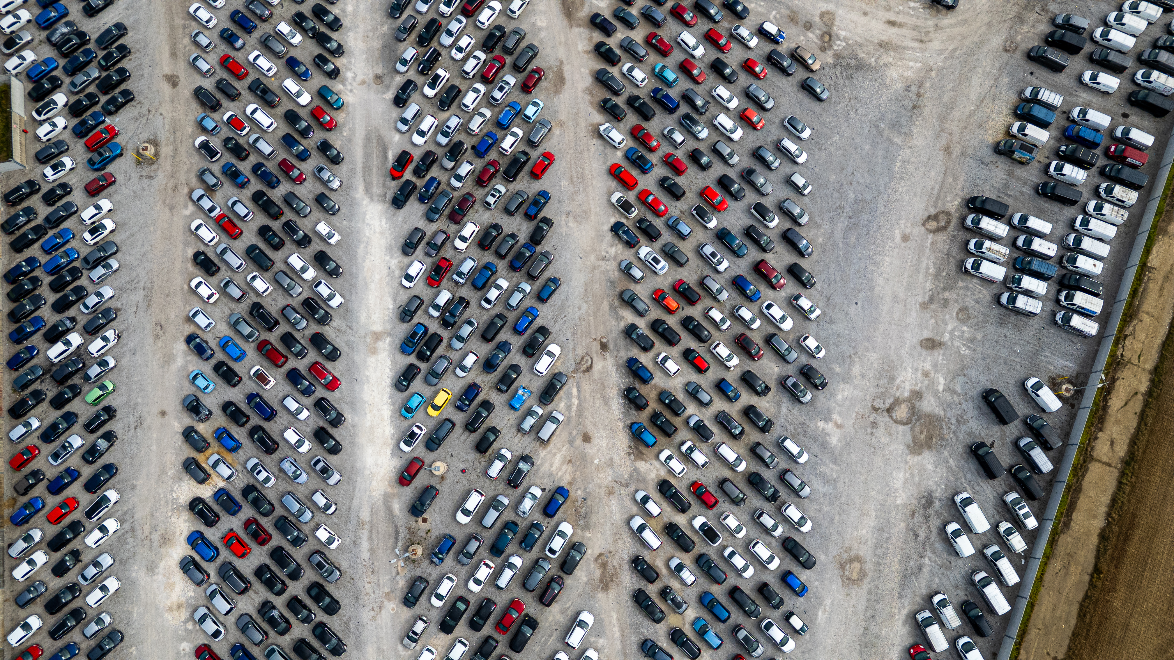An aerial view of a large outdoor car storage lot filled with numerous cars parked in rows on a gravel surface at Copart yard in York, UK.