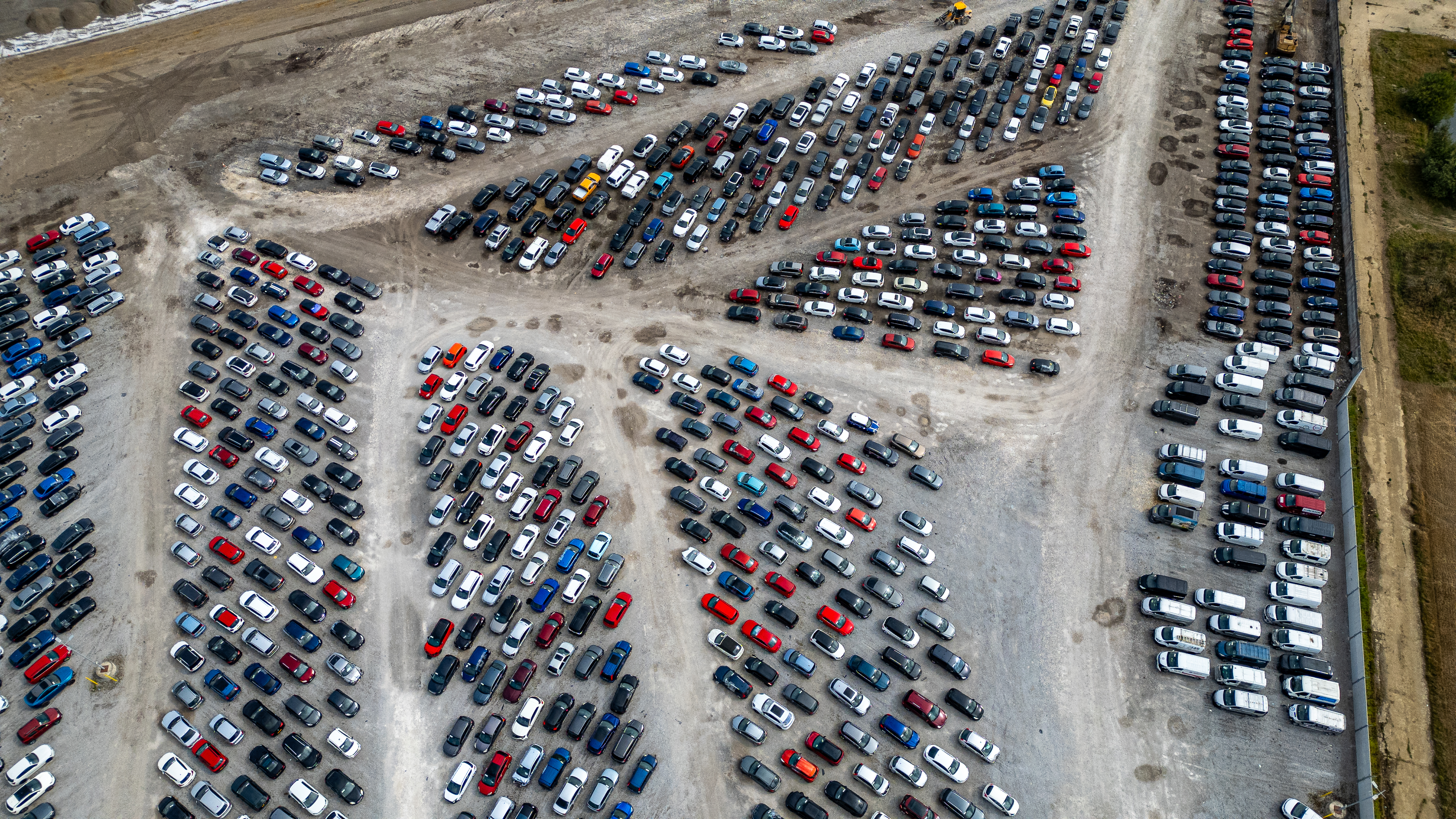 An aerial view shows a large outdoor lot filled with rows of parked cars, mostly dark-colored, on a gravel surface at Copart yard in York, UK.