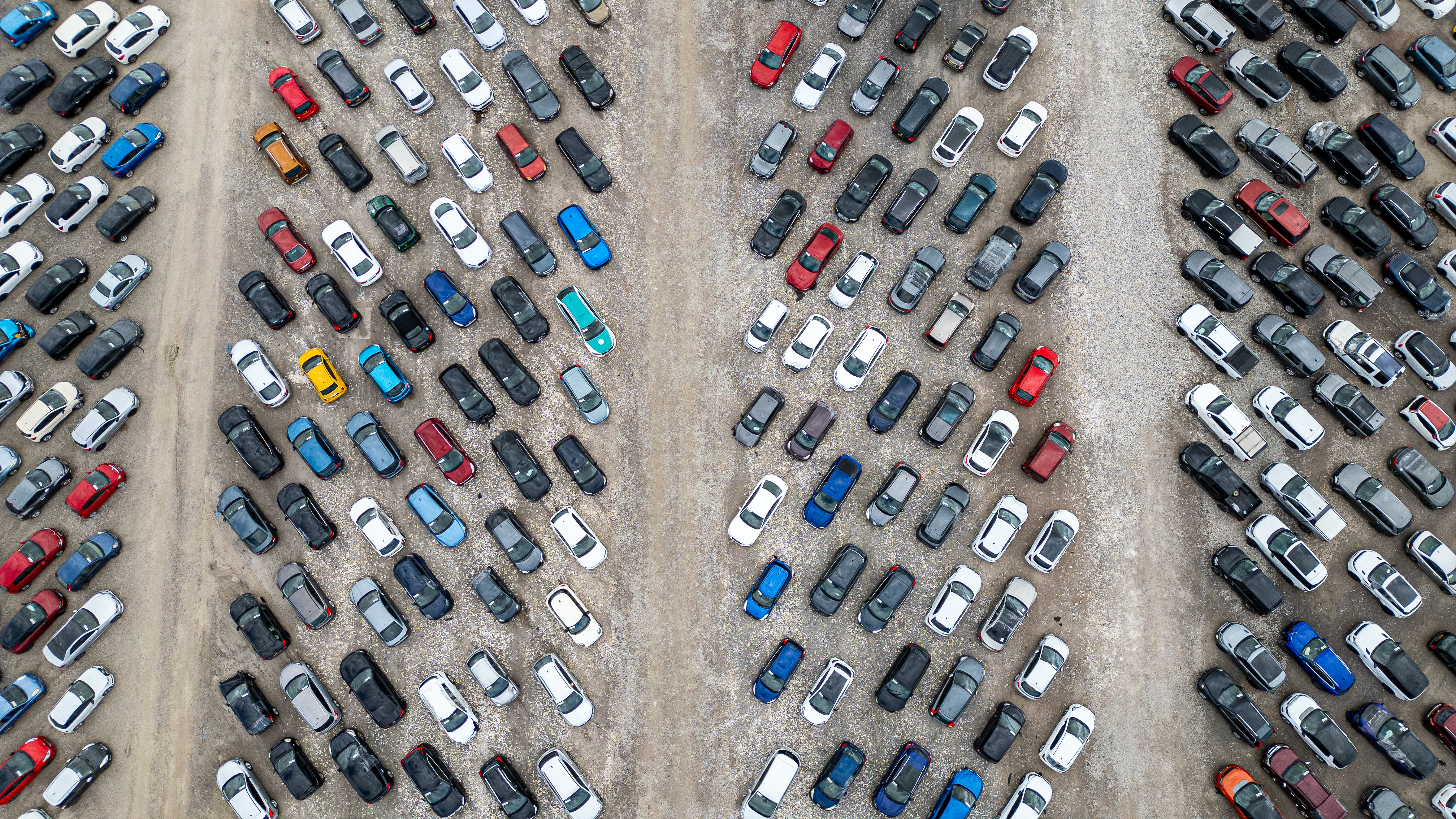 Aerial view of a large outdoor parking lot filled with rows of various colored cars on a dirt and gravel surface at Copart yard in York, UK.