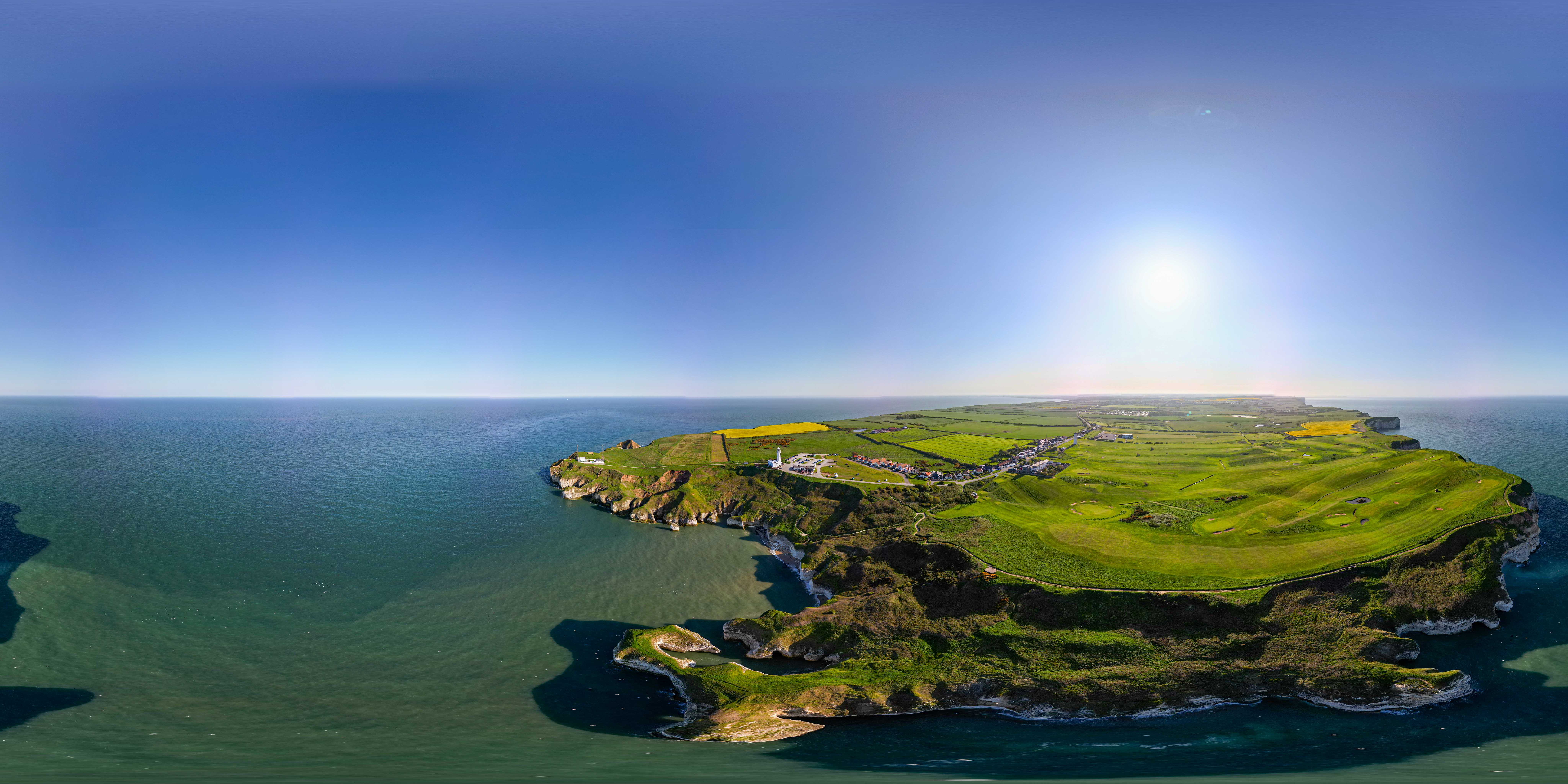 Panoramic aerial view of a lush green island surrounded by blue ocean under a clear sky in Flamborough, England
