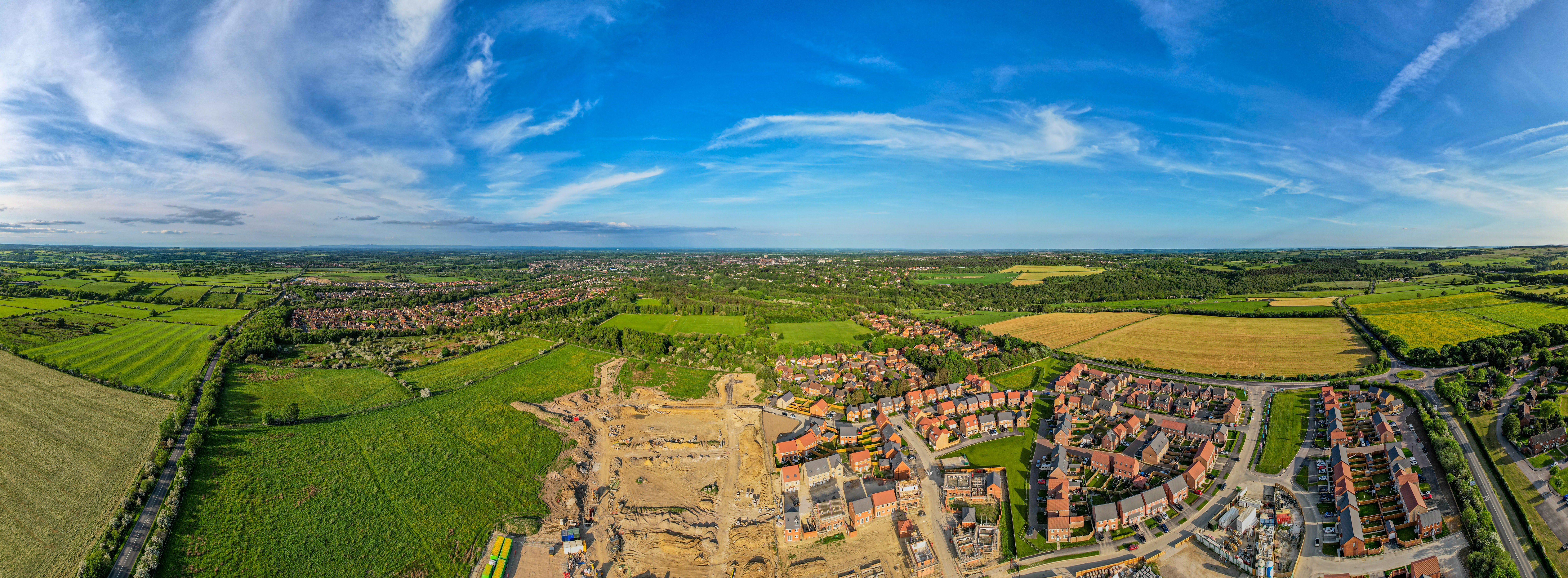 Panoramic aerial view of a quaint town with surrounding green fields under a blue sky with clouds.