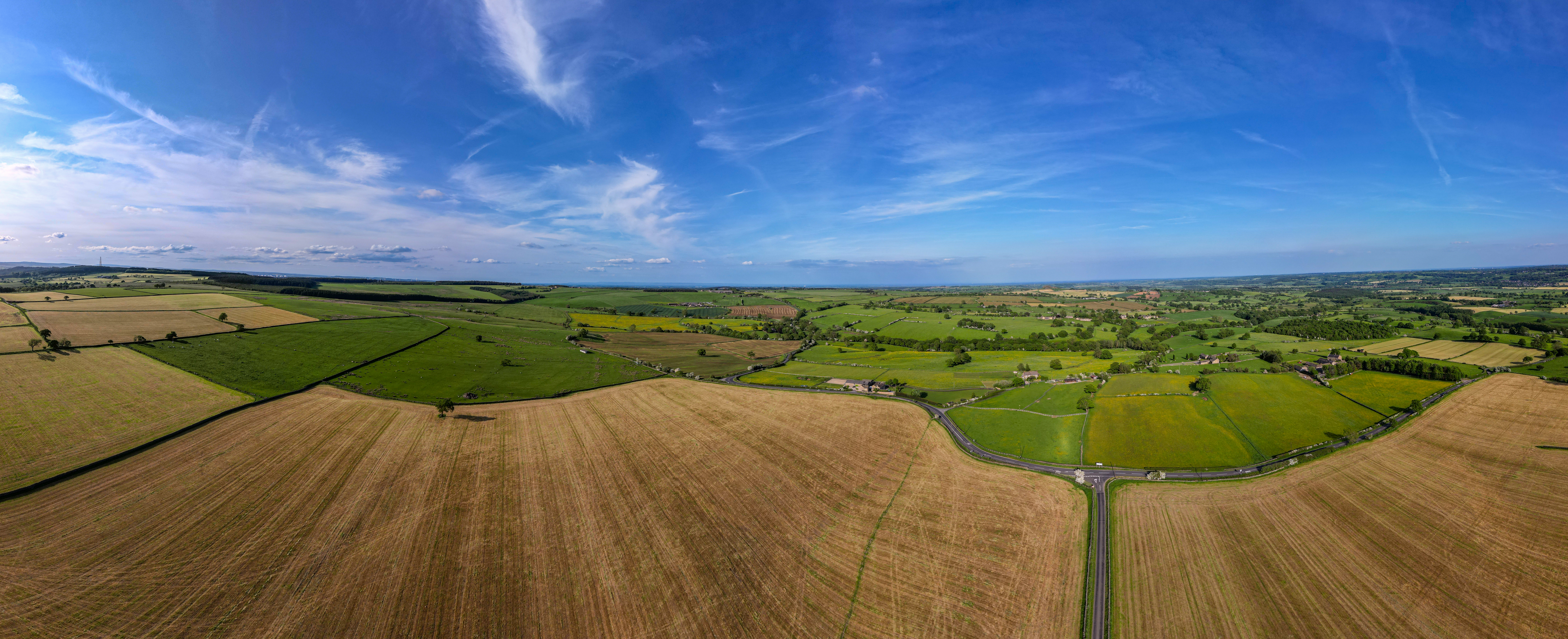 Panoramic aerial view of lush countryside with fields and a road under a blue sky.