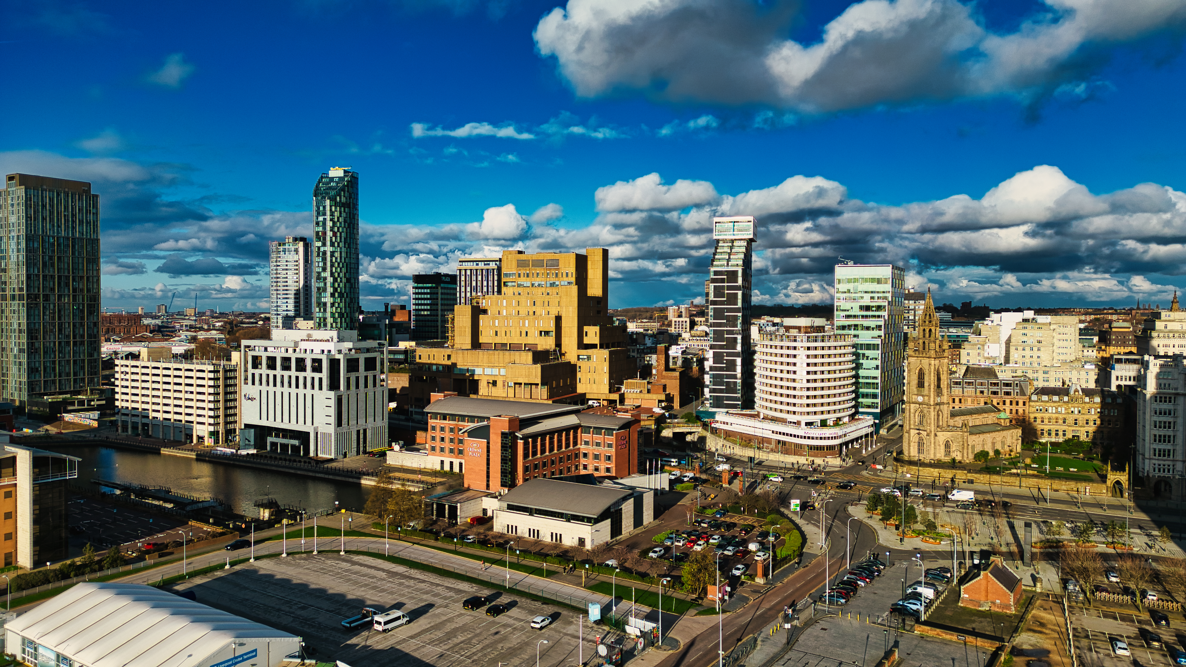 Panoramic cityscape with modern skyscrapers under a blue sky with fluffy clouds in Liverpool, UK.