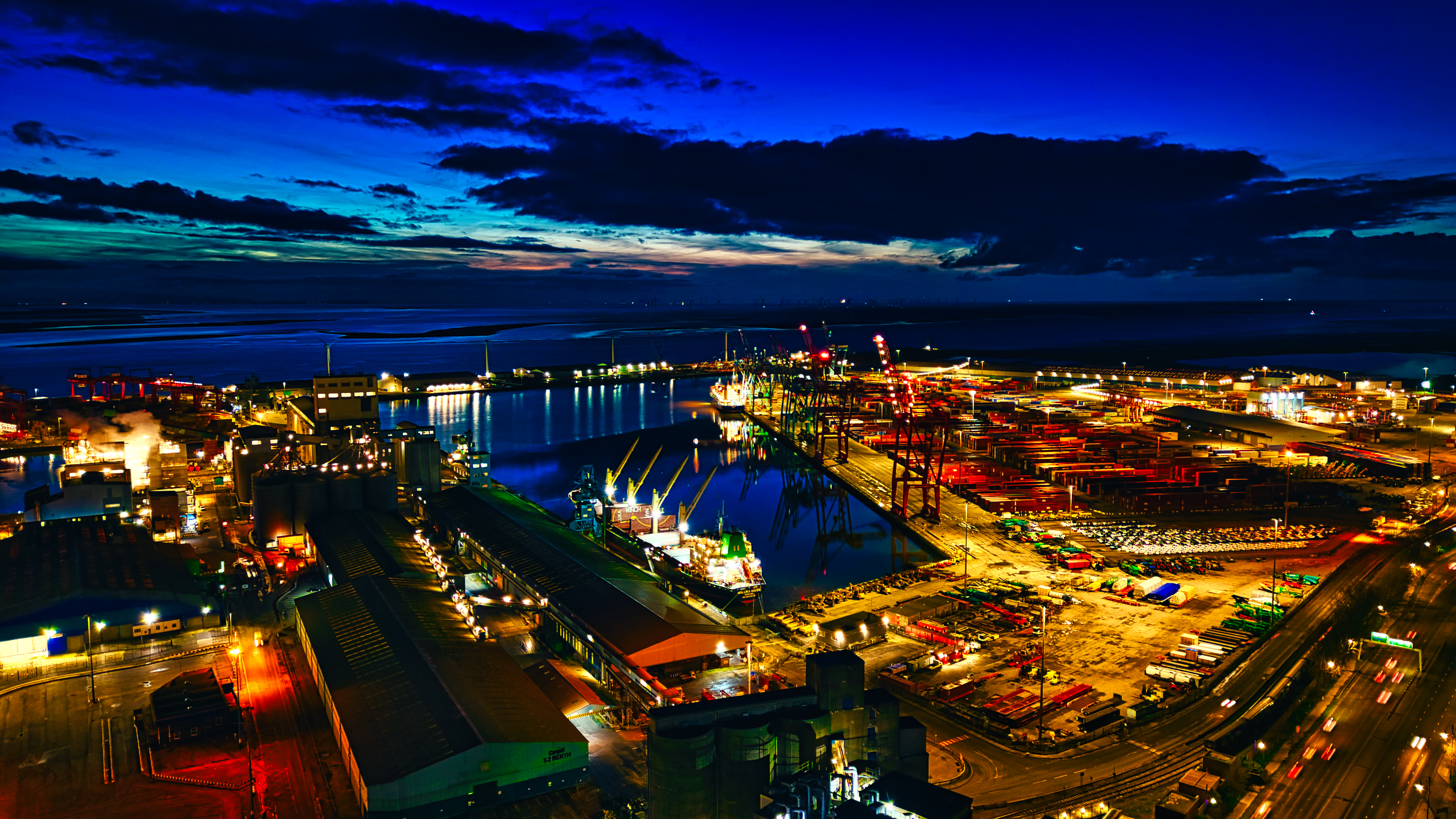 Panoramic night view of a bustling industrial port with illuminated cranes, containers, and buildings against a twilight sky in Liverpool, UK.