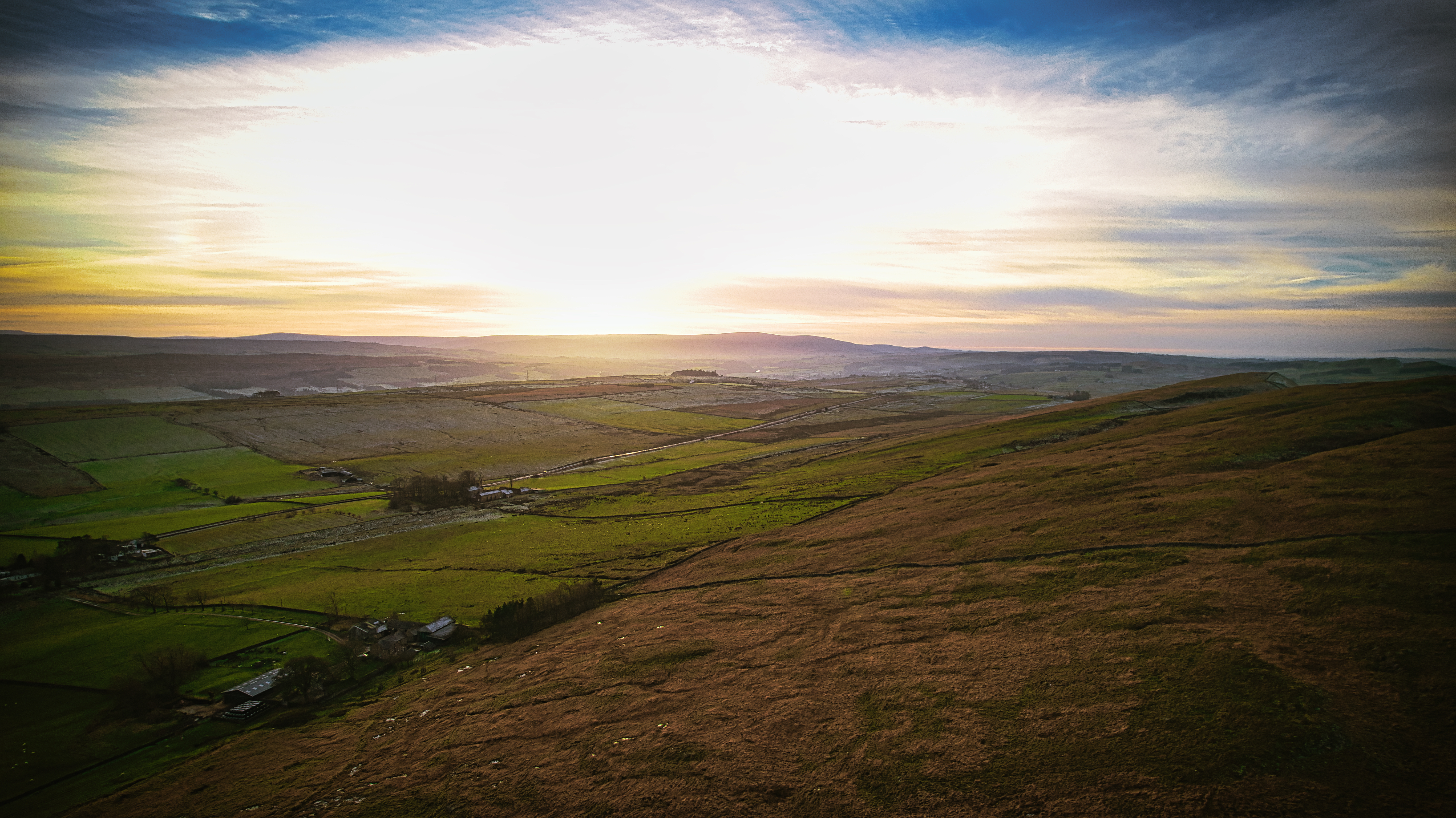 Panoramic view of a tranquil countryside at sunset with rolling hills and a dramatic sky at Sycamore Gap, Northumberland, UK.
