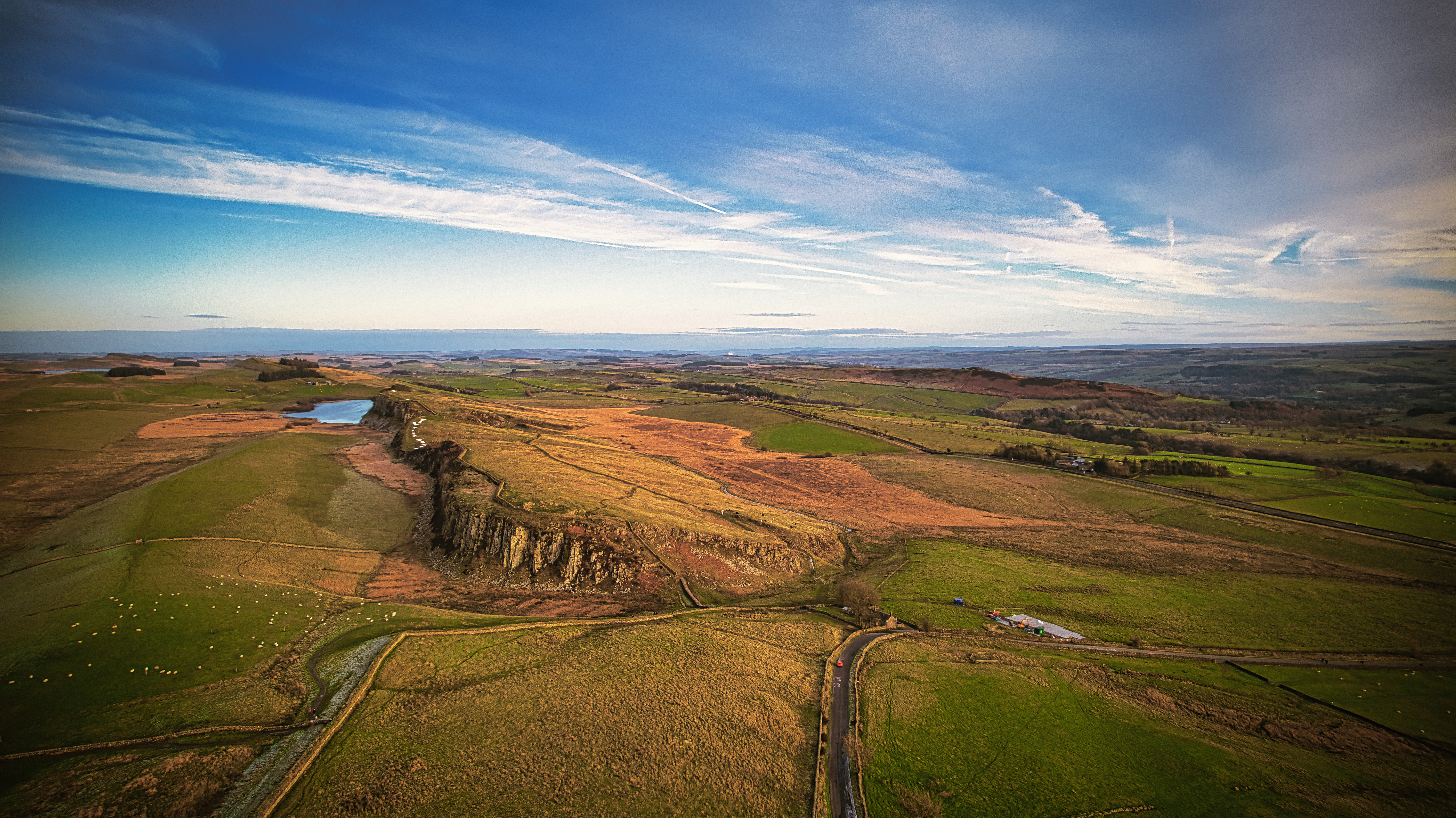 Panoramic view of a vast, rolling countryside with a clear sky, showcasing natural beauty and open fields at Sycamore Gap, Northumberland, UK.