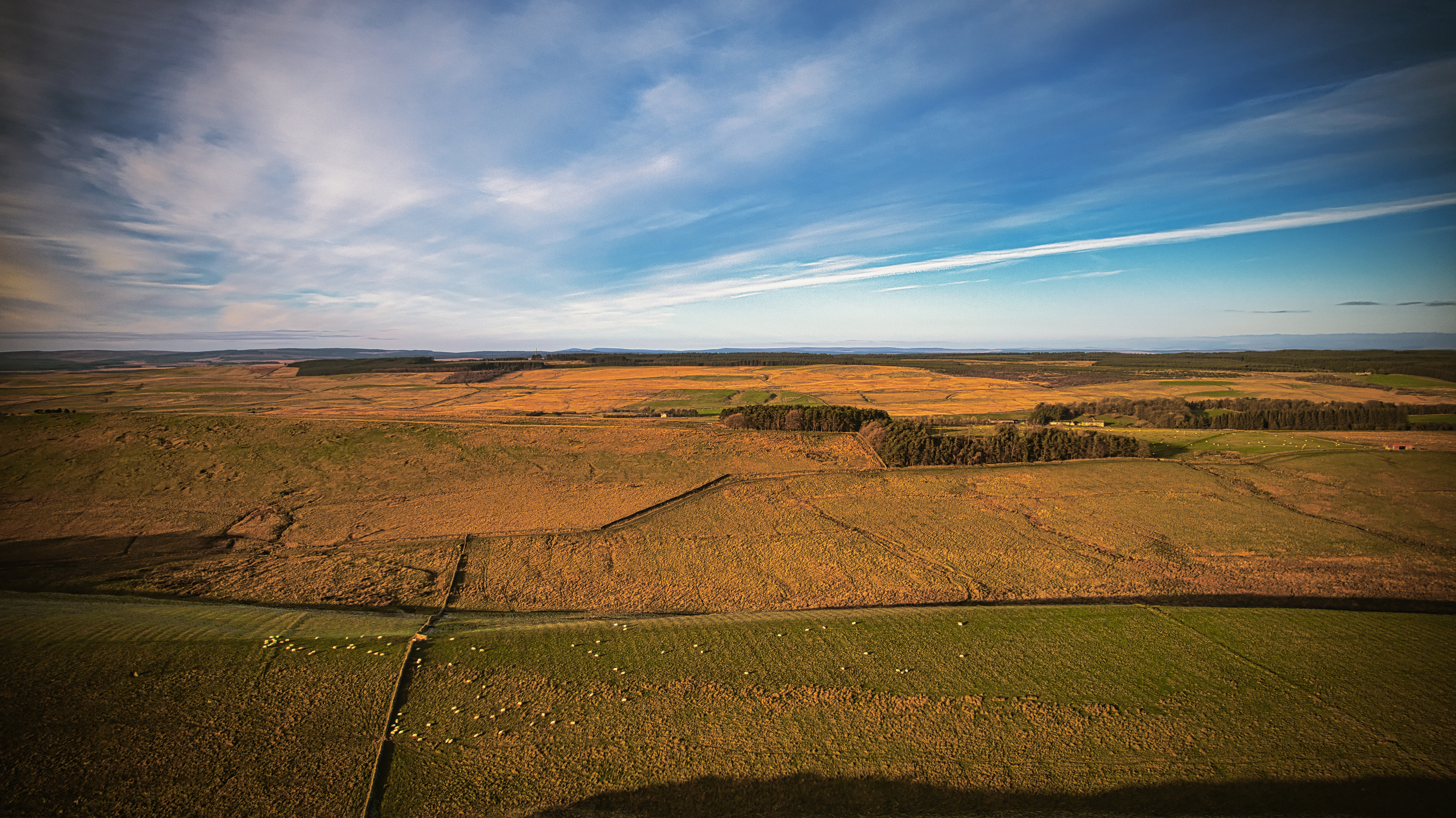 Panoramic view of a vast rural landscape with fields under a wide blue sky with clouds at Sycamore Gap, Northumberland, UK.