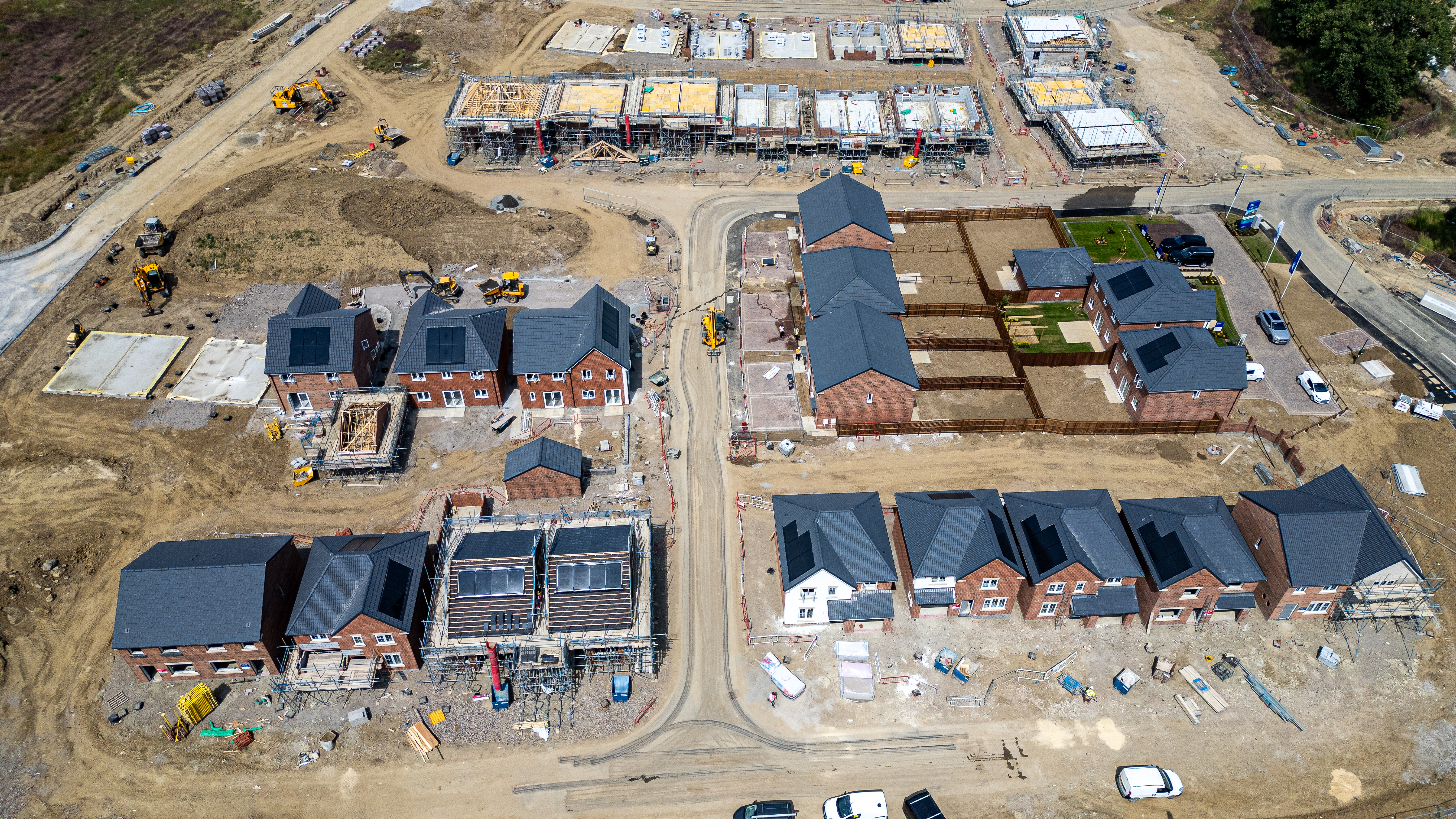 Aerial view of a residential construction site with houses in various stages of completion, construction equipment, and raw land at Miller Homes in Catterick, UK.