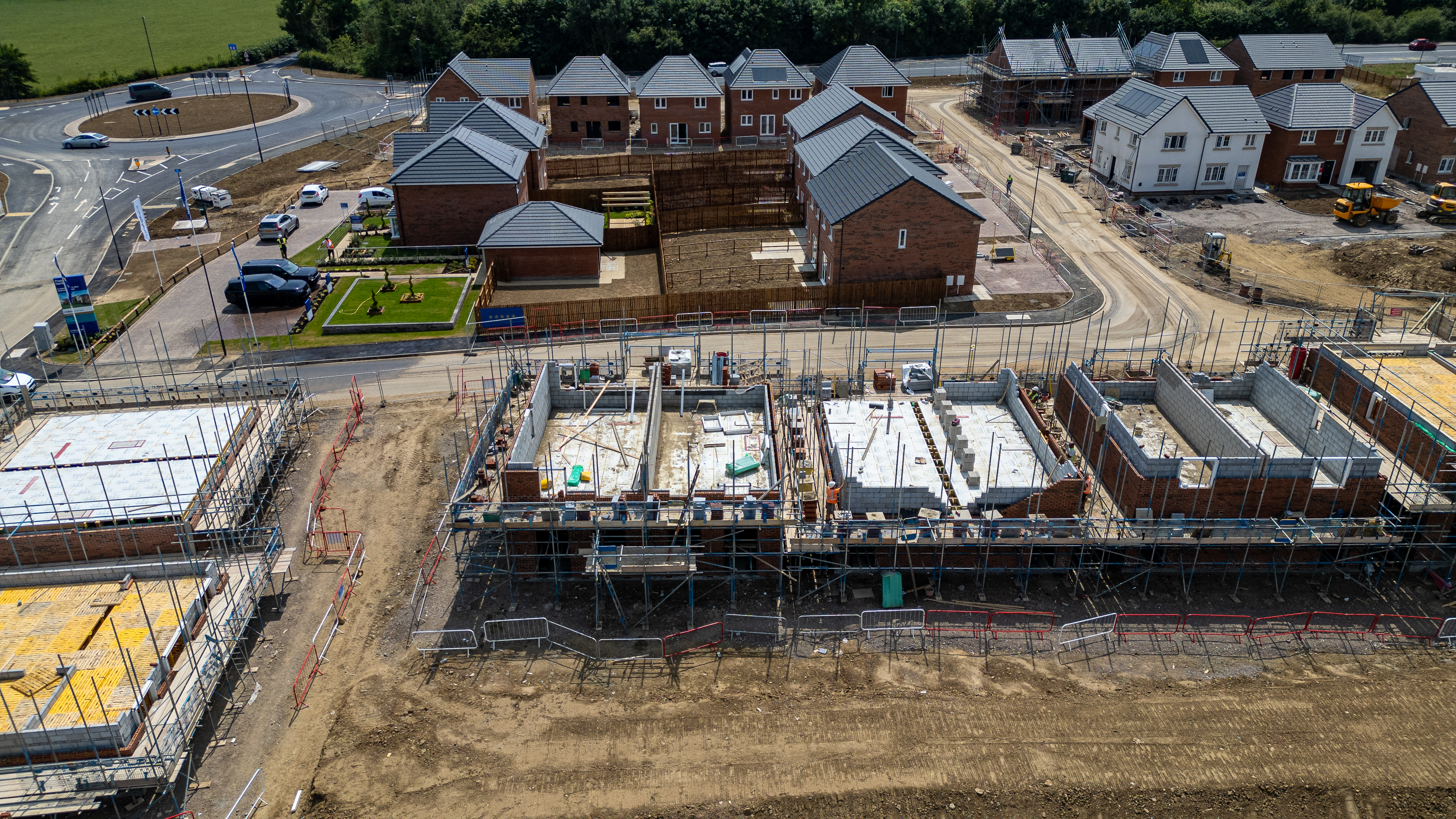 Aerial view of a residential construction site with new homes in various stages of development, featuring unfinished foundations and brickwork alongside completed houses at Miller Homes in Catterick, UK.