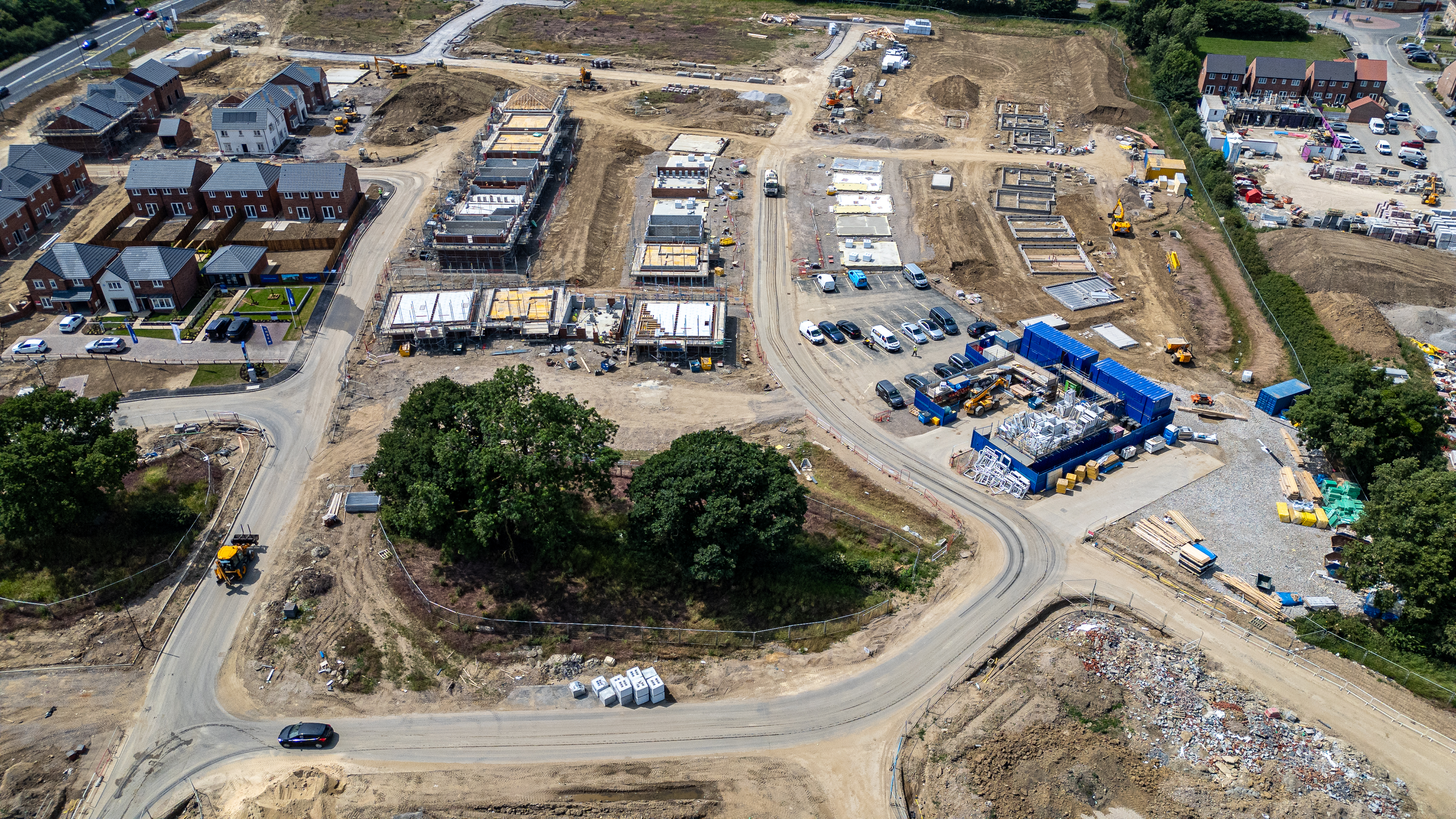 Aerial view of a residential construction site showing partially built homes, foundations, roads, construction equipment, and materials at Miller Homes in Catterick, UK.