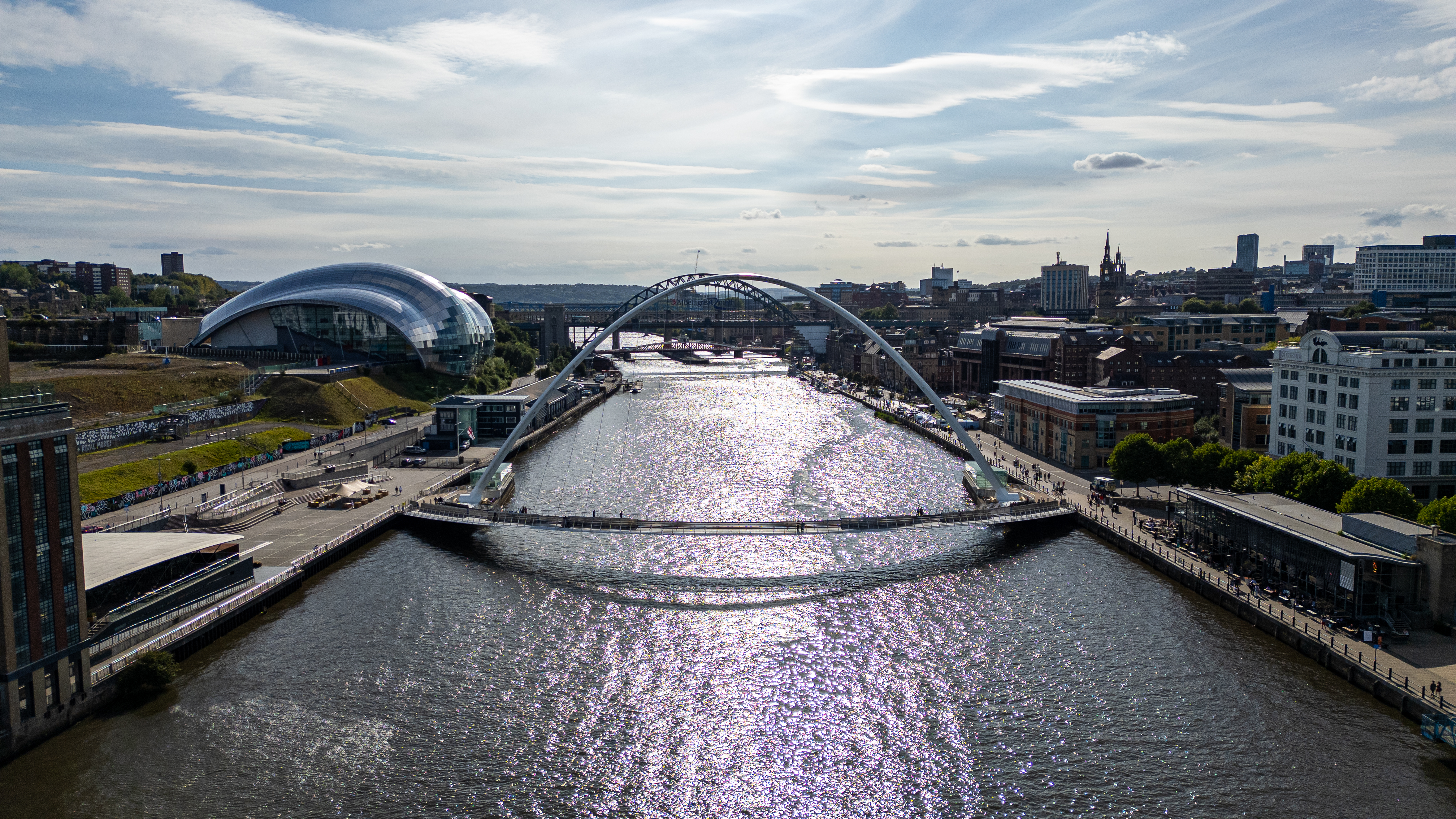 Aerial view of a city landscape featuring a river spanned by two distinct bridges, with modern and traditional architecture, and a cloudy sky in Newcastle upon Tyne, UK.