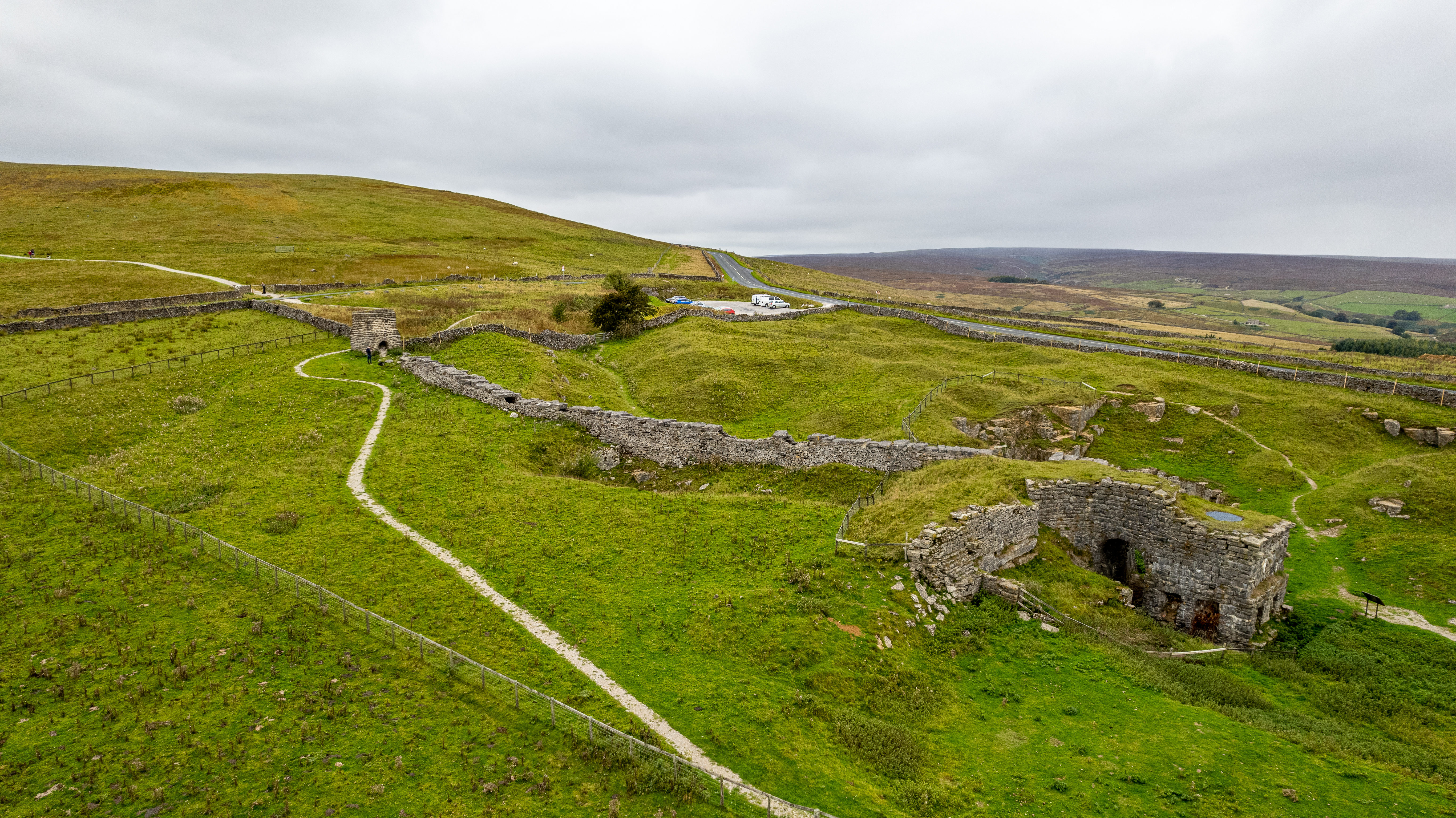 Rolling green hills with a stone wall and a ruin, under a cloudy sky, depicting rural landscape.