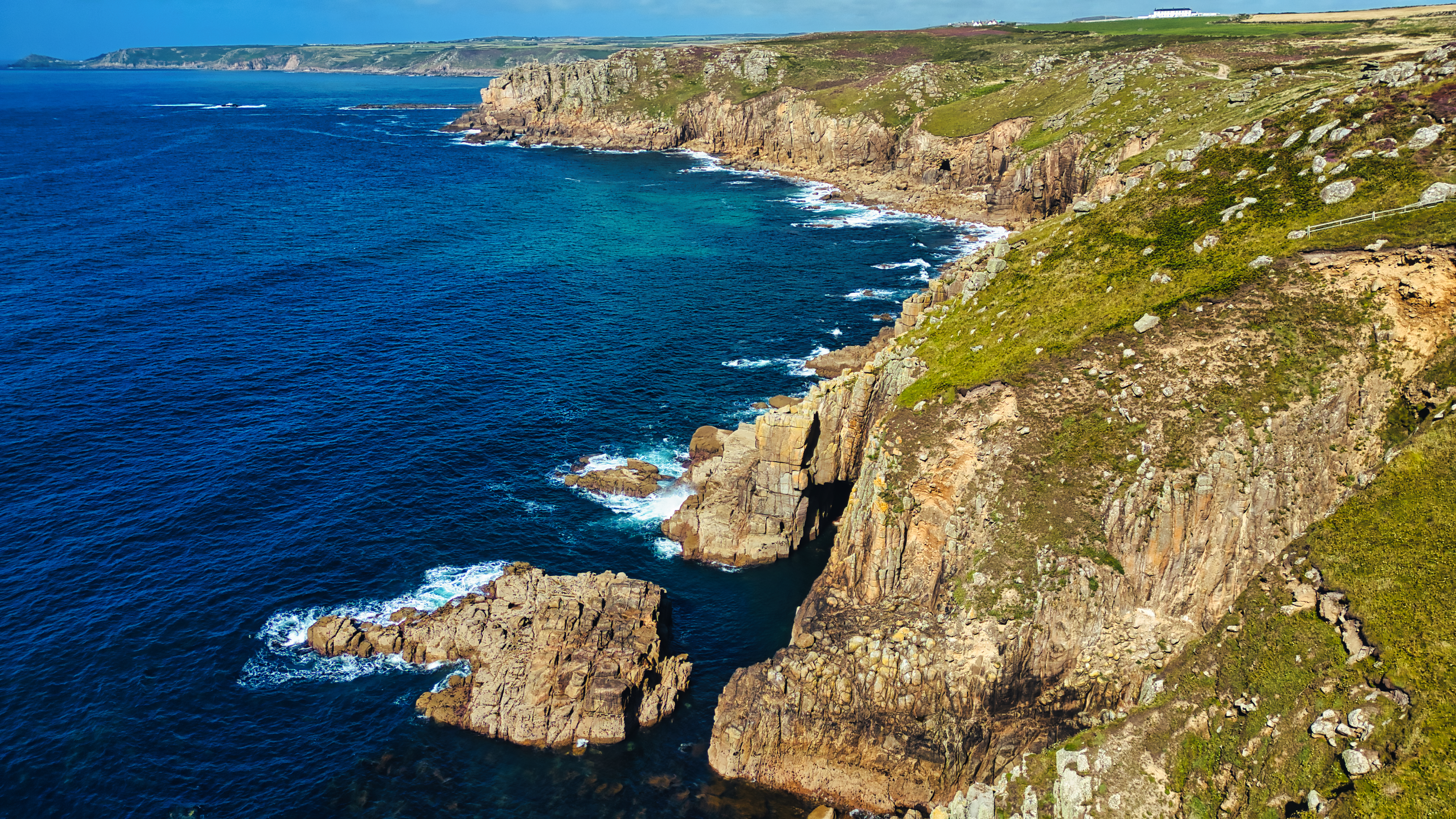 A stunning coastal view featuring rugged cliffs and clear blue waters. The landscape showcases a mix of rocky formations and lush greenery, with waves gently crashing against the shore. The horizon reveals a distant coastline under a clear sky.