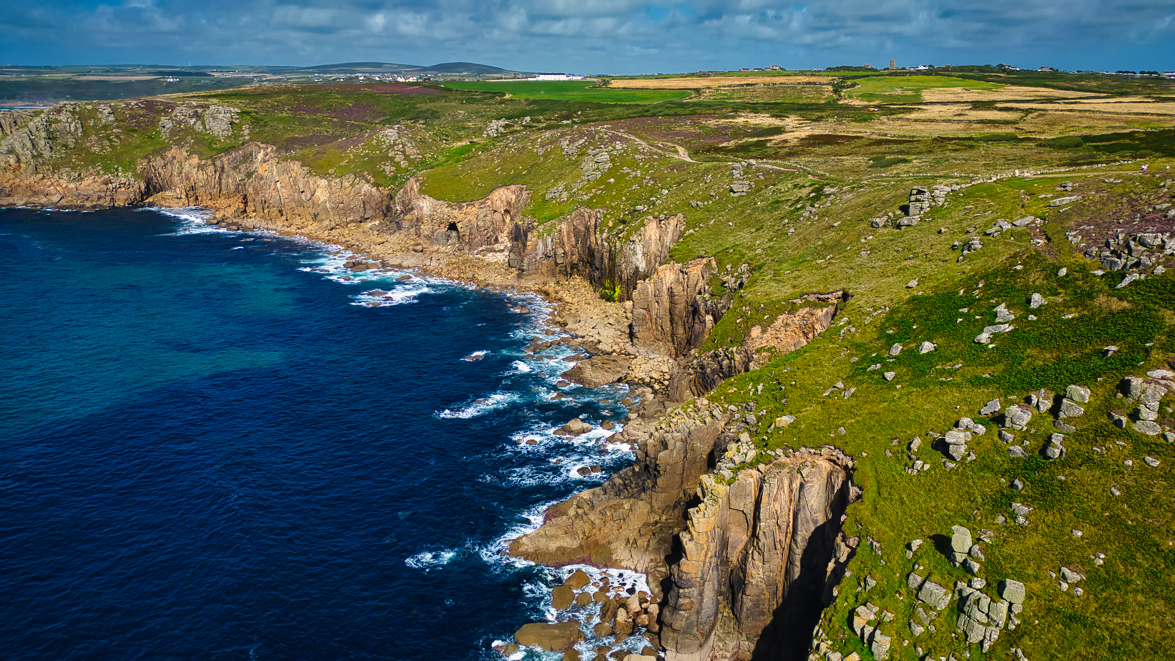 Aerial view of rugged coastal cliffs meeting the deep blue sea, with lush green fields and rolling hills in the background. The coastline features rocky formations and waves crashing against the shore under a partly cloudy sky.