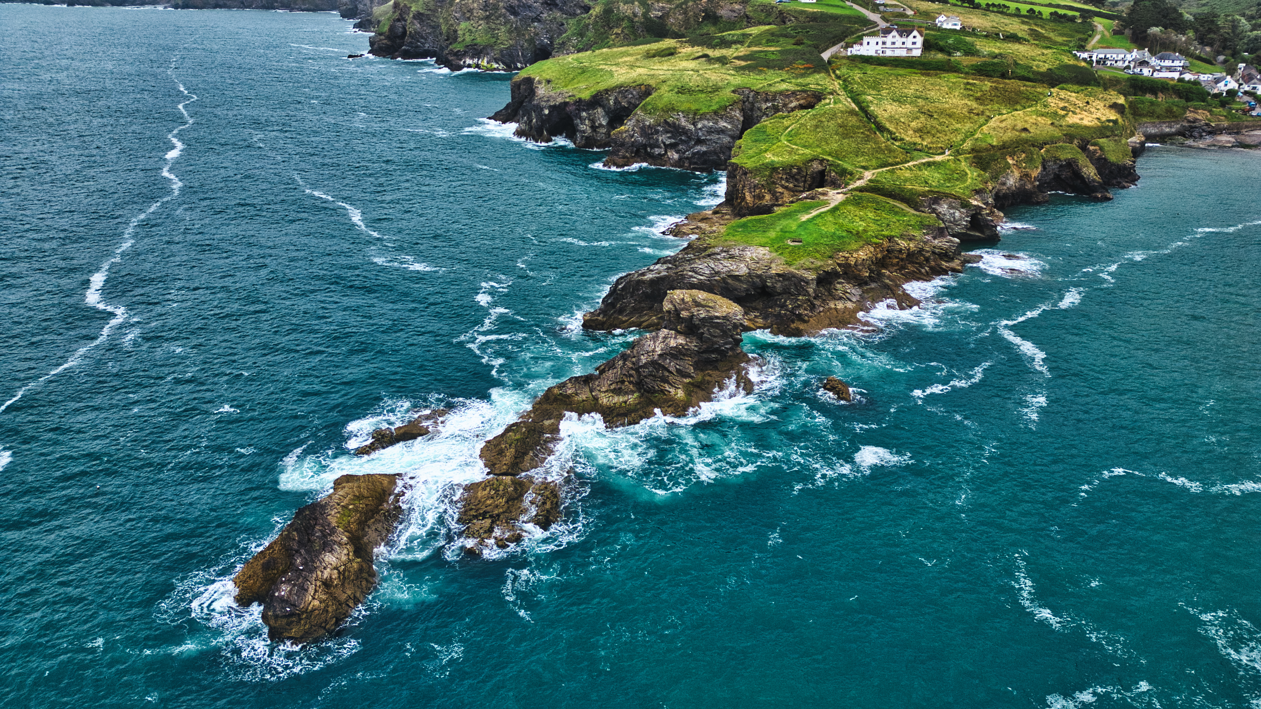 Aerial view of a rocky coastline with lush green hills and white houses on the cliffs. Waves crash against the rocks, creating foam in the turquoise water. The landscape is scenic and tranquil, showcasing the beauty of nature.