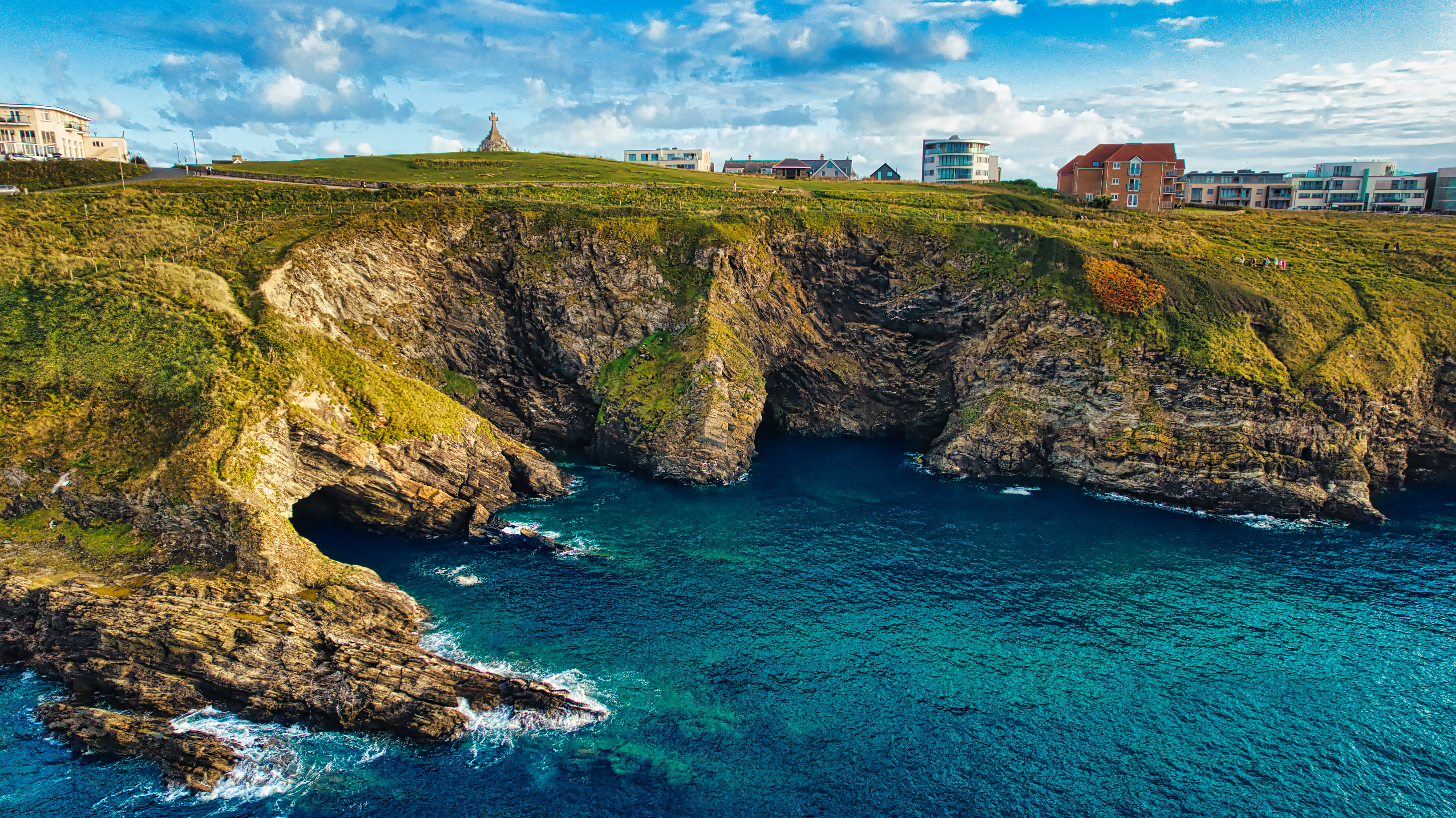 A scenic coastal view featuring rugged cliffs, clear blue waters, and a grassy hillside. The landscape includes a mix of natural rock formations and modern buildings in the background, under a partly cloudy sky.