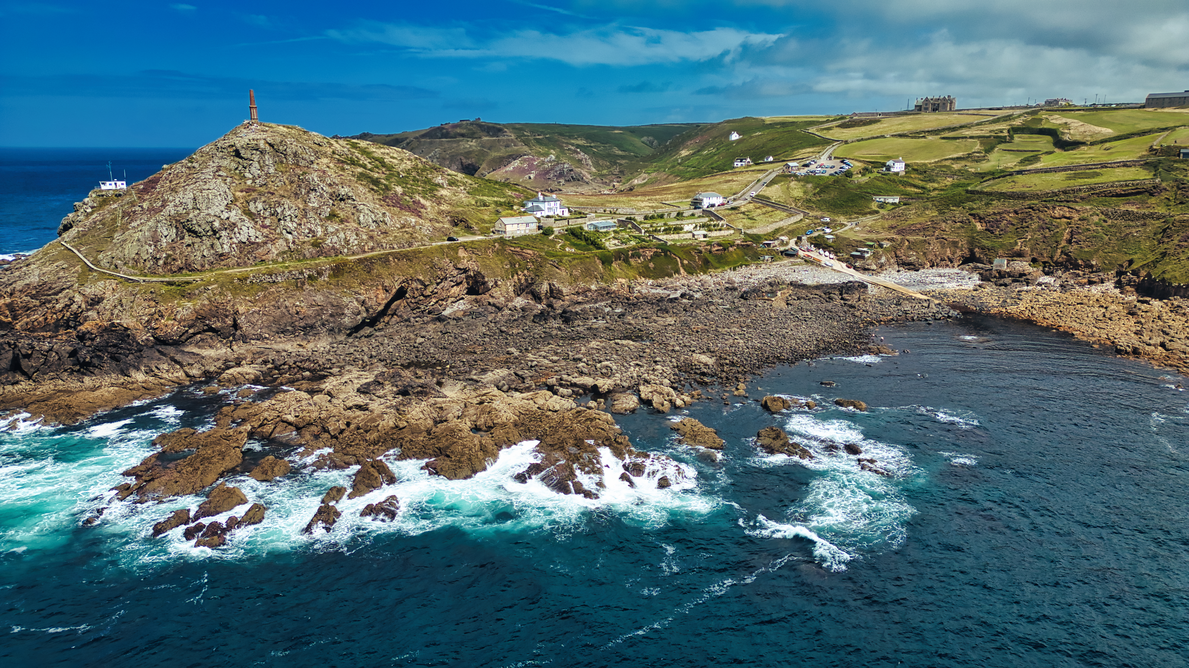 A scenic coastal landscape featuring rocky shores, rolling hills, and a lighthouse on a hilltop. The ocean waves crash against the rocks, with a clear blue sky and scattered clouds in the background. A small village is visible near the coastline.