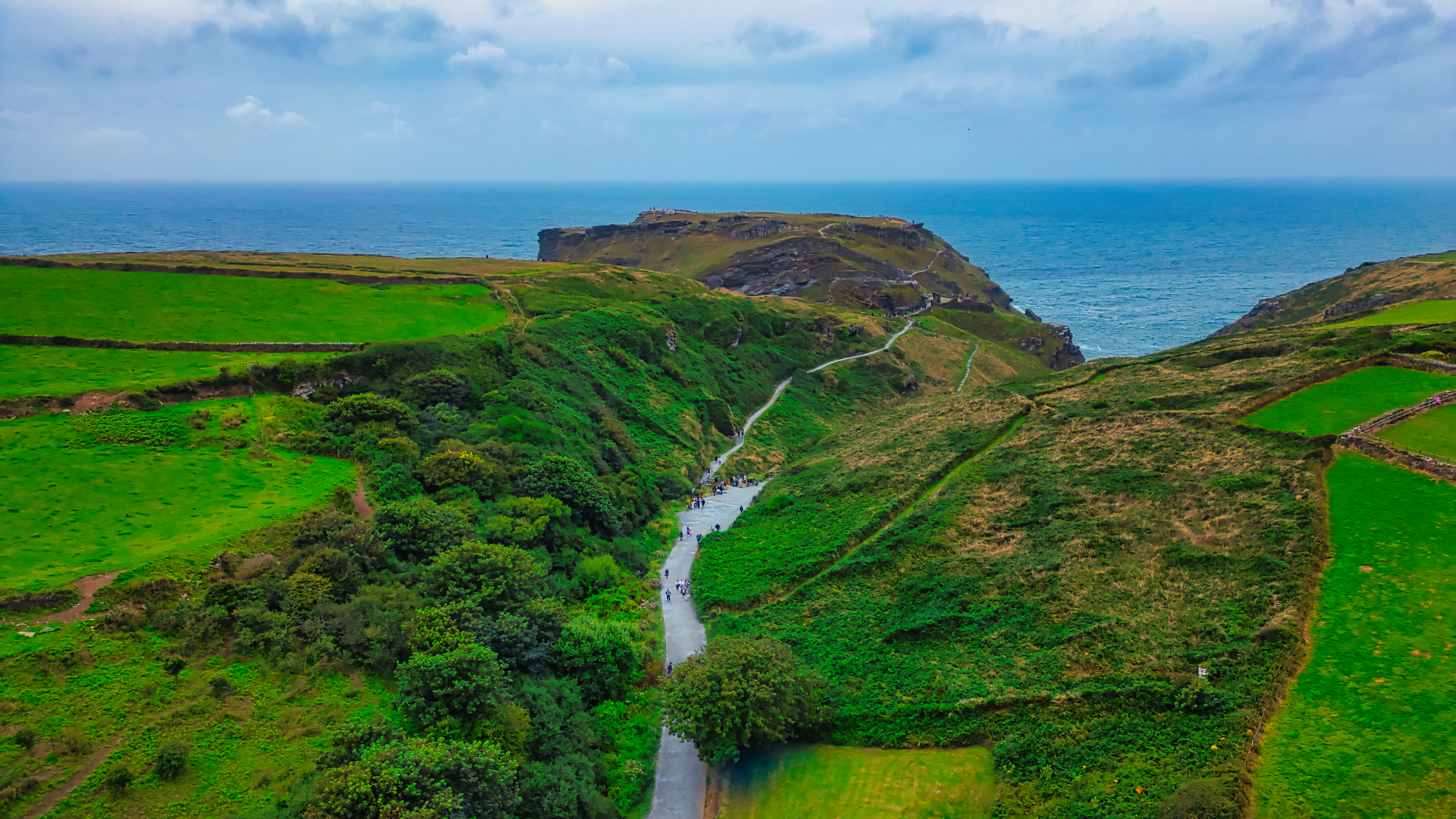 A scenic coastal landscape featuring lush green fields, a winding river, and cliffs overlooking the ocean. The sky is partly cloudy, adding depth to the serene atmosphere.