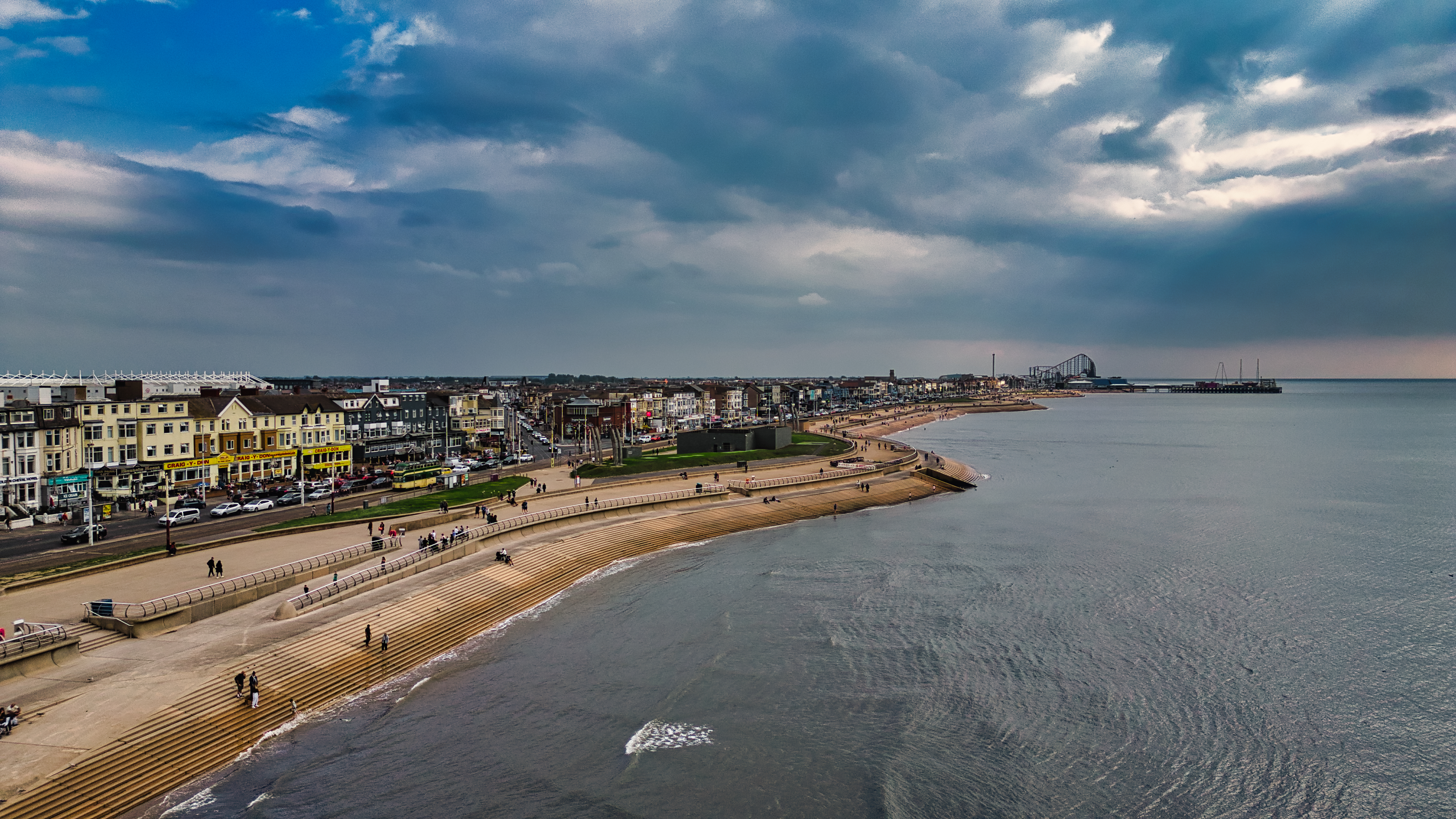 A scenic view of a coastal town with a sandy beach, promenade, and buildings lining the shore. The sky is overcast with hints of blue and gray, and people are walking along the beach and promenade. The ocean is calm with gentle waves.