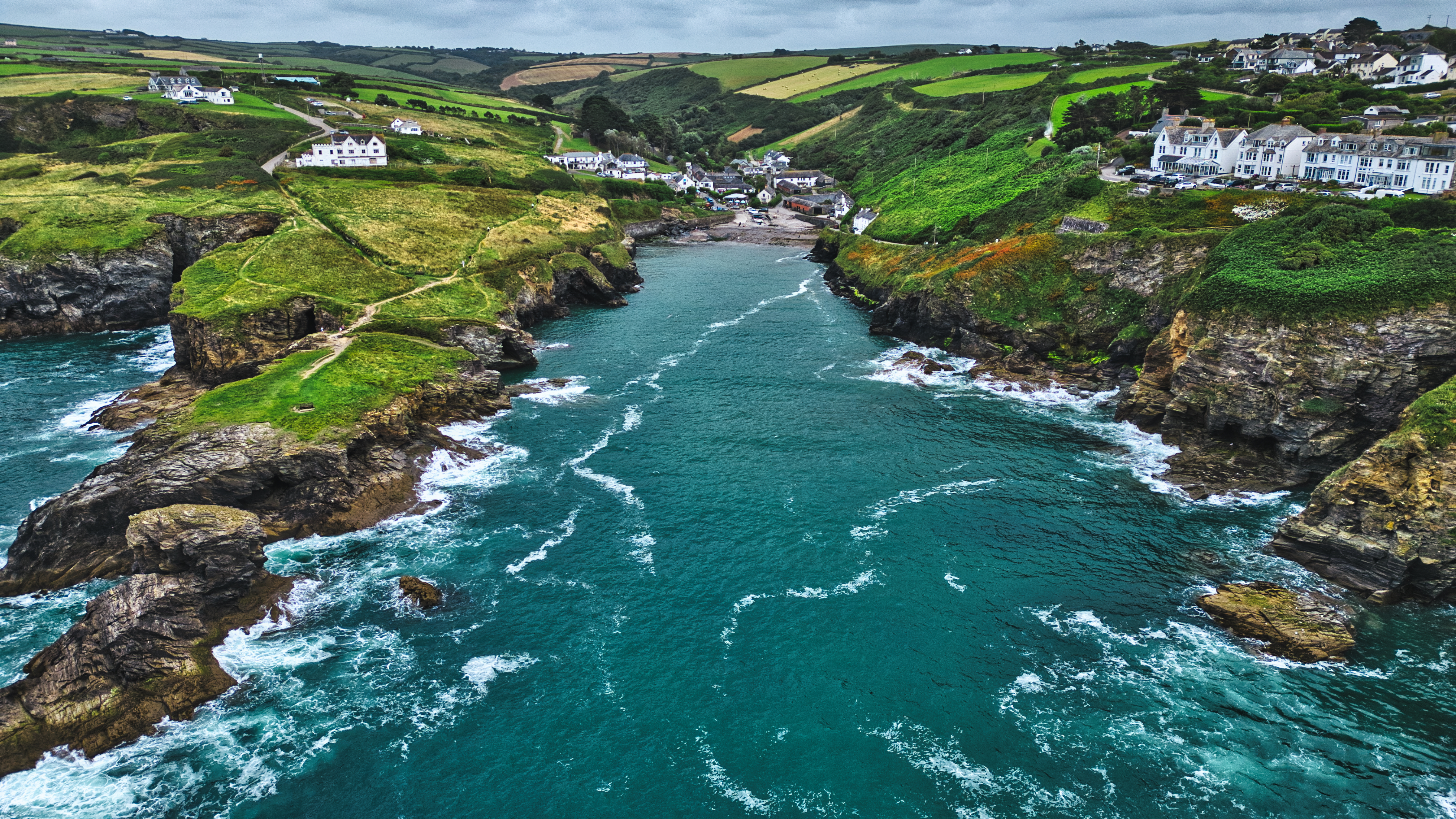 A scenic coastal view featuring rocky cliffs, lush green hills, and a tranquil blue sea. Small white houses dot the landscape, nestled among the greenery, with waves gently crashing against the shore.