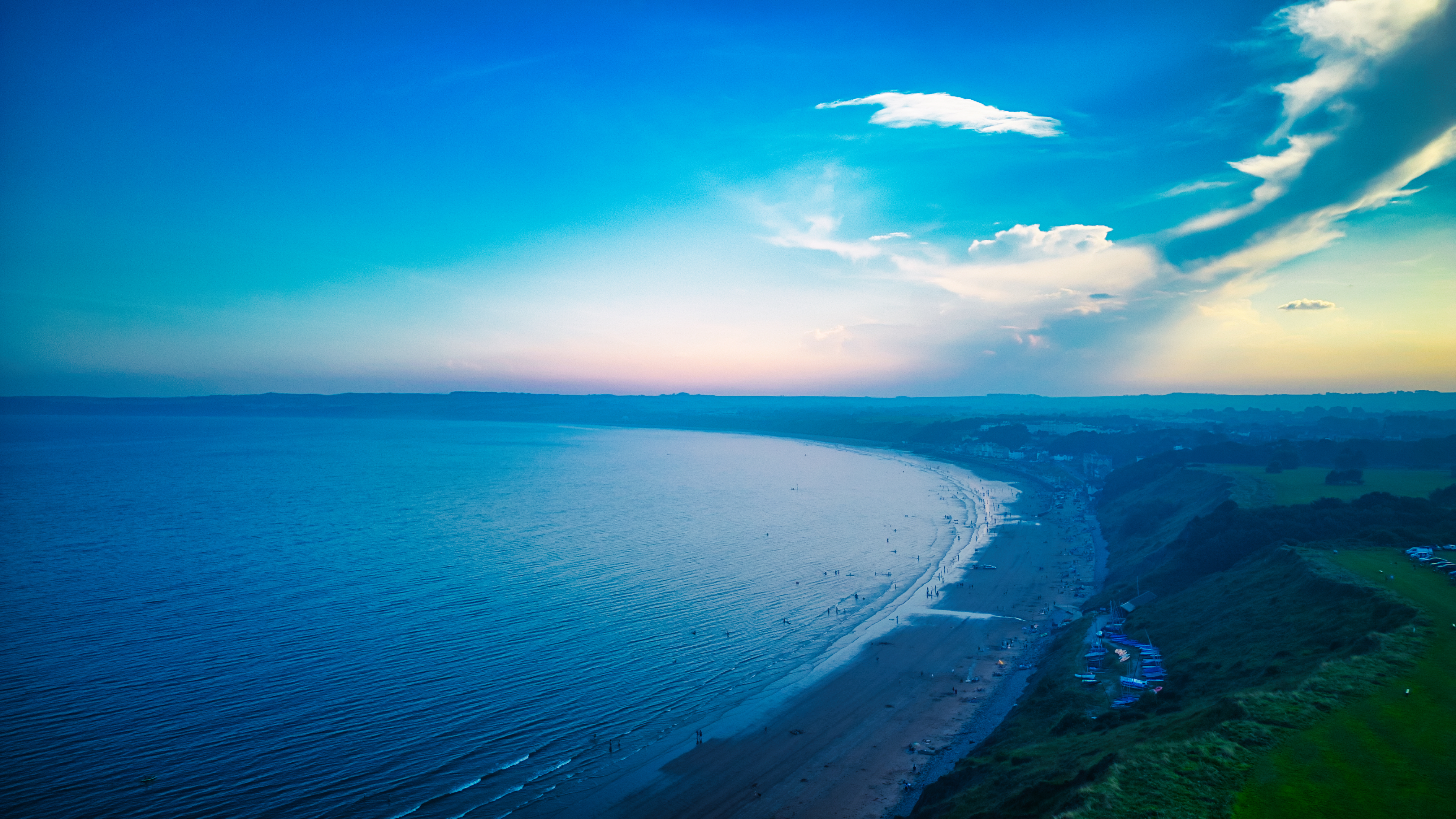 Scenic aerial view of a coastline at sunset with vibrant blue skies and a calm sea in Filey, England.