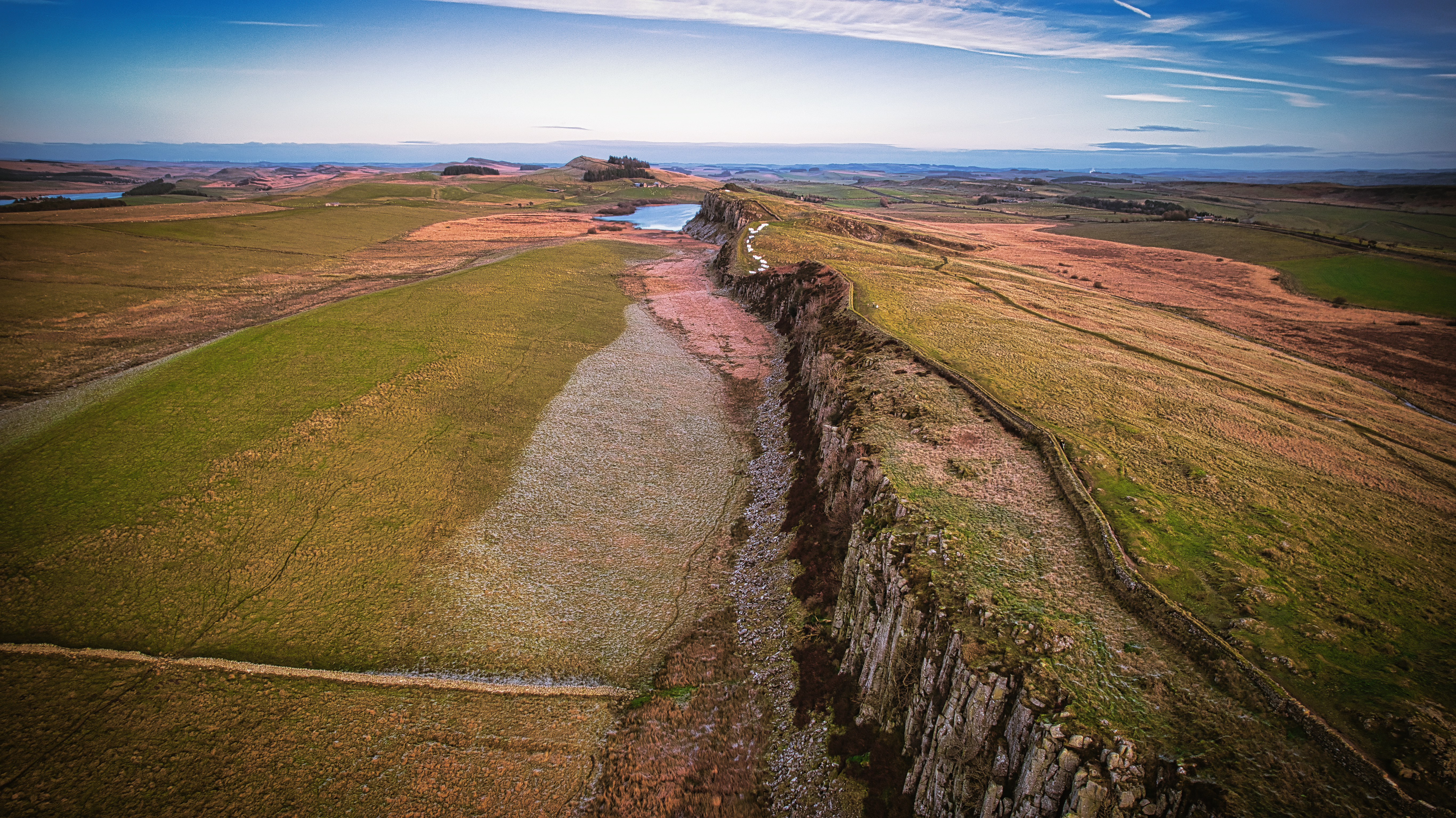 Scenic aerial view of a historic countryside path along a rocky cliff with expansive fields under a blue sky at Sycamore Gap, Northumberland, UK.