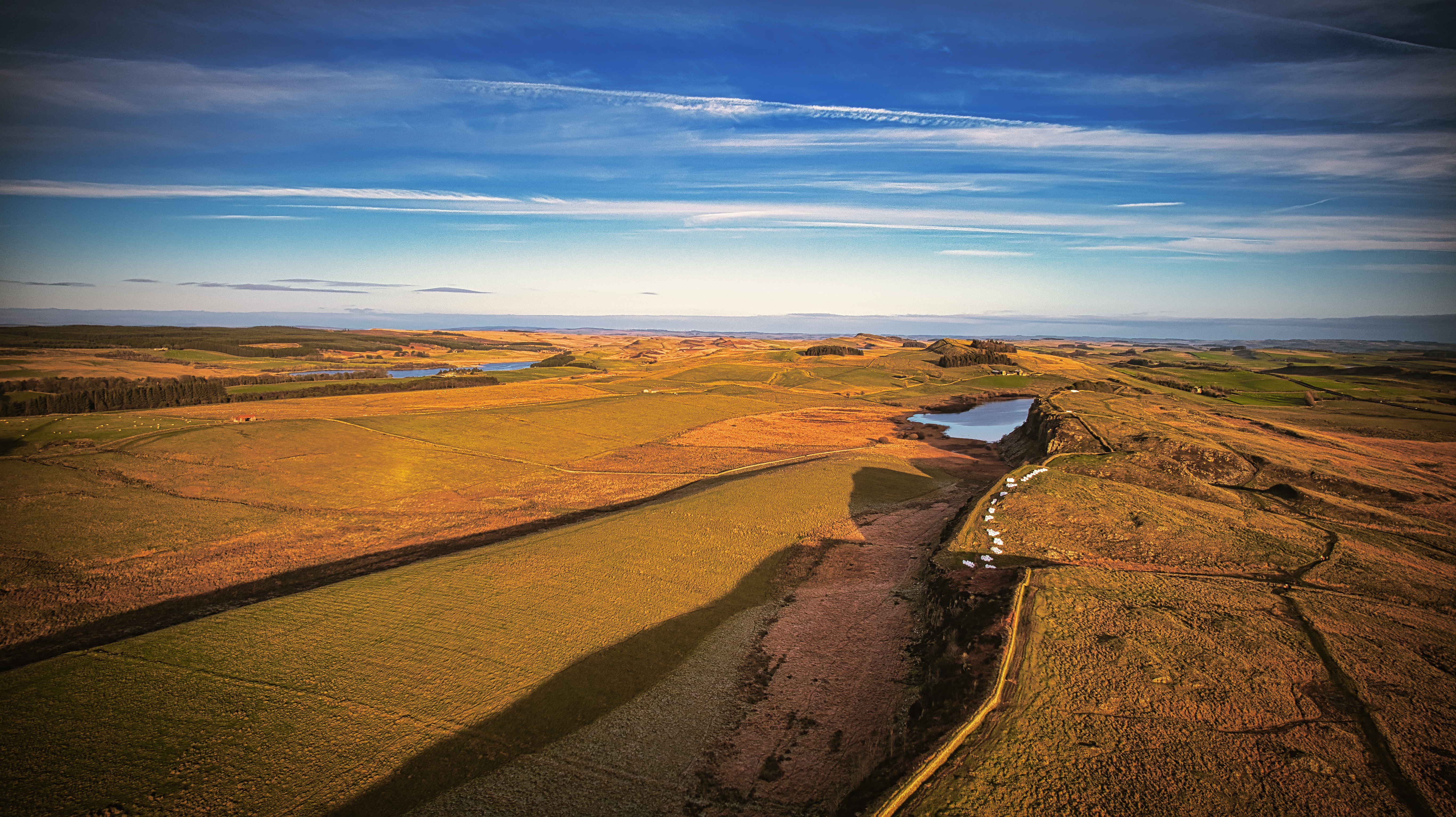 Scenic aerial view of a winding river through a vast, colorful landscape under a blue sky with clouds at Sycamore Gap, Northumberland, UK.