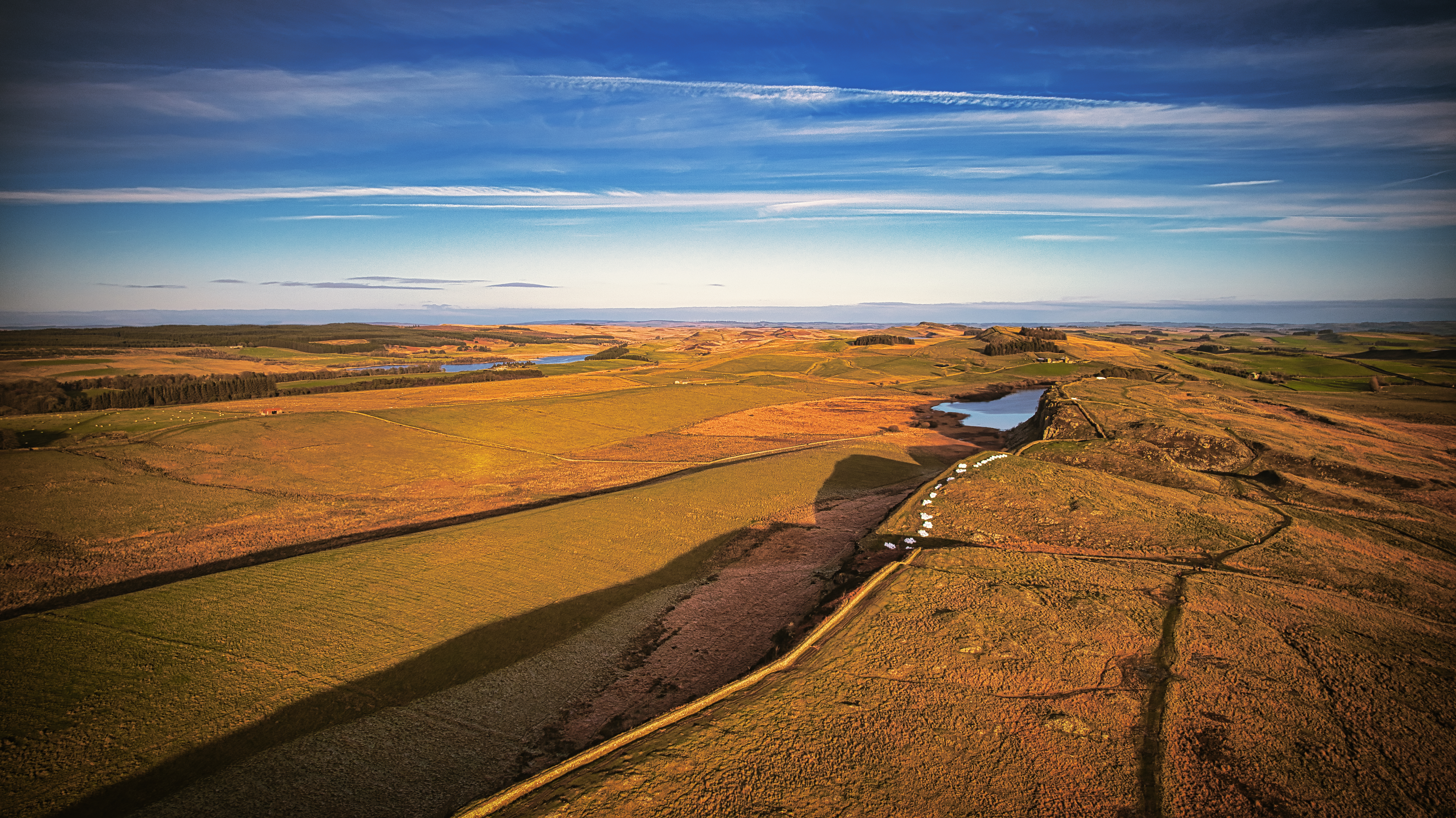 Scenic aerial view of a winding river through a vast, colorful landscape under a blue sky with clouds at Sycamore Gap, Northumberland, UK.