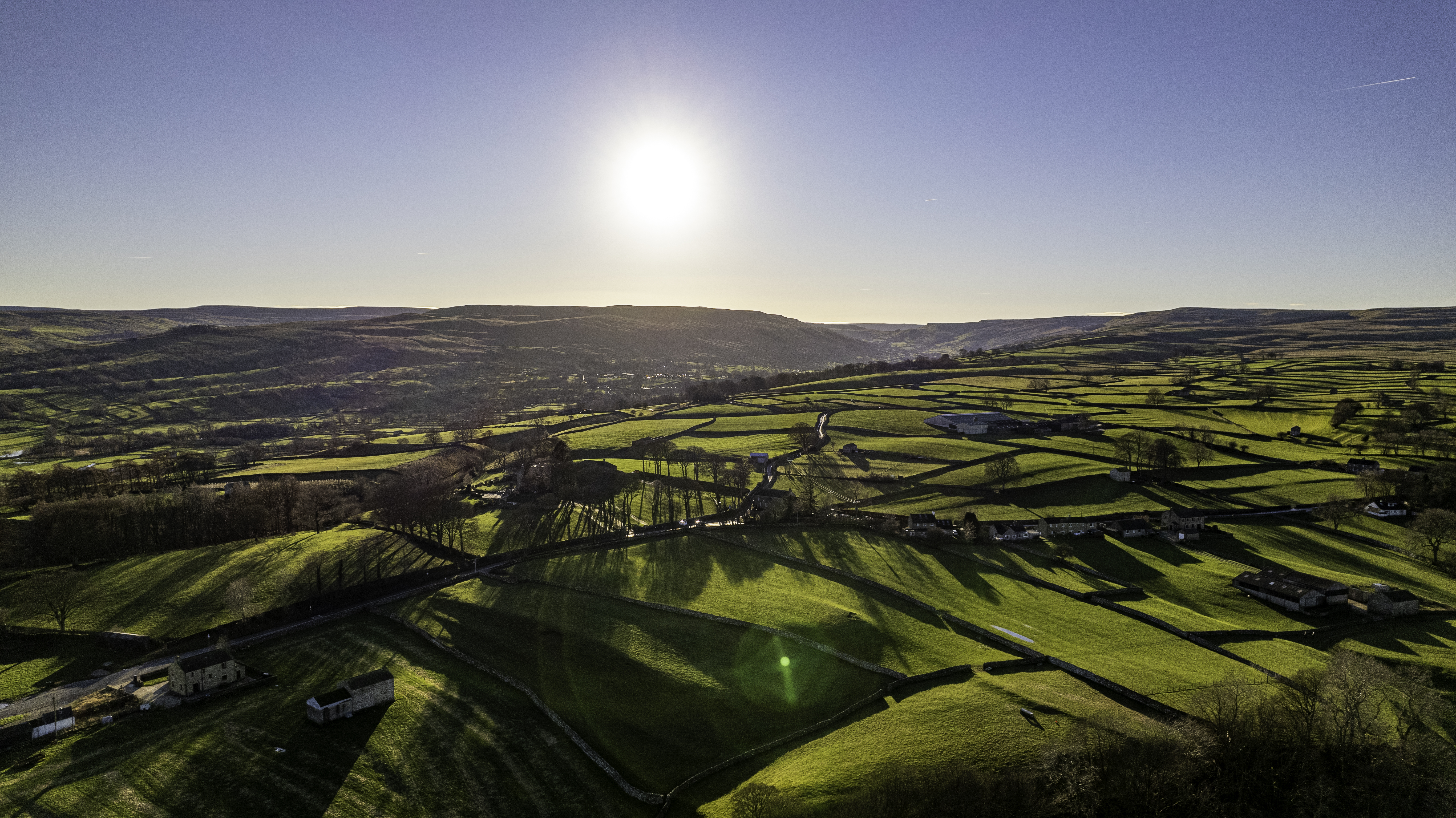 Scenic aerial view of lush countryside with sun casting shadows over patchwork fields and rolling hills.